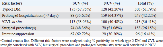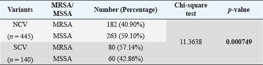 Table 2. Showing association of different risk factors among SCV and NCV isolates of S. aureus (%).