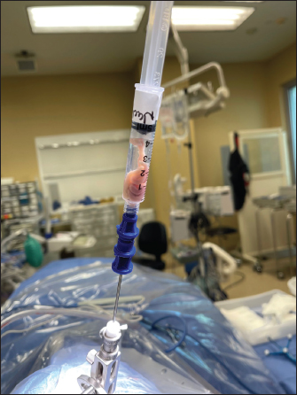 Fig. 1. Brain abscess biopsy. DiscussionBrain abscesses are rare but potentially fatal infections of the central nervous system, as seen in the patient presented above. They can spread directly from the head and neck, seen in relation to otitis media 5% of the time as well as mastoiditis, paranasal sinus infections (30%–50% of the time), frontal and ethmoidal sinuses, and dental infections (Lange et al., 2018). Other causes of direct inoculation such as trauma or recent neurosurgery can also yield a brain abscess. Septicemia and hematogenous spread can also be the culprit; most commonly, a lung infection, such as pneumonia, empyema, or as a sequelae of cystic fibrosis can cause a distant seeding into the central nervous system (Lange et al., 2018). Other common causes of infectious spreading occur secondary to skin, pelvic, and intra-abdominal infections (Lange et al., 2018). While studies vary, the incidence of brain abscesses is estimated to be 8% of all intracranial masses in developing countries and 1%–2% in Western countries (Osenbach and Loftus, 1992). Contributing factors include AIDS and the use of broad-spectrum antibiotics and steroids. On the other hand, vaccinated children have yielded a decreased rate of brain abscess formation in that age group. Most commonly, adult men <30 years old and children between the ages of 4–7 years old are affected (Shachor-Meyouhas et al., 2010). A brain abscess develops over time with the histopathology changing with its development and can be broken down into four stages. The first stage, which occurs over the first 1–4 days, can be referred to as cerebritis, with localized edema and vascular congestion (Muzumdar et al., 2011). The second stage, which spans infection days 4–10, is called late cerebritis. Thereafter, an early capsule formation occurs from days 11–14, with the fourth and final stage, called the capsule formation, occurring after 2 weeks time (Muzumdar et al., 2011). After 2–3 weeks, liquefaction and necrosis occur (Hassel et al., 2018). In the case of continuous spread from the face and neck, bacterial species such as Bacteroides, Peptostreptococcus, and Streptococcus are the most common culprits. The latter Strep species are most commonly seen in patients with cardiovascular anomalies, such as cyanotic heart disease and right-to-left shunts (Muzumdar et al., 2011). Streptococcus and Staphylococcus can also be seen in prior neurosurgical interventions; these species, in addition to Clostridium and Enterobactericea, are seen in open-head trauma (Muzumdar et al., 2011). Fungal infections, Toxoplasma and Pseudomonas are typically seen in immunocompromised patients. This population includes patients with HIV, transplant recipients, those on chemotherapeutics, and long-term steroid usage (Muzumdar et al., 2011). History and physical provide key features that can help lead to correct diagnostic work-up; however, the nonspecific features can yield delayed treatment. Some common associated signs and symptoms include a headache, a change in mental status, focal neurological deficits, pain on the side where the abscess is located, fever, nausea, and vomiting (Patel and Clifford, 2014). The triad of headache, fever, and neurological deficit is seen in less than ⅓ of all reported cases, making it difficult to find pathognomonic signs of such a diagnosis (Patel and Clifford, 2014). Patient evaluation should include multiple sources of information and collateral information. Routine laboratory work, such as a complete blood count with differential, erythrocyte sedimentation rate, CRP, and blood cultures before the usage of antibiotics should be the initial laboratory work performed. As for imaging, an MRI is considered the modality of choice for diagnosis (Corsini Campioli et al., 2021). It allows radiologists and physicians to have a better perspective regarding the amount of inflammation and can detect satellite lesions otherwise missed by other imaging modalities (Corsini Campioli et al., 2021). However, a CT scan helps with early detection, and localization, and can show associated factors such as edema and elevated mass-associated midline shift (Muzumdar et al., 2011). Once identified, surgical aspiration can be utilized to culture the abscess for proper antibiotic and/or antifungal coverage (Corsini Campioli et al., 2021). Treatment regimens depend on the underlying pathogen causing the abscess. Gram-positive bacteria, as seen in our patient described above, can be covered with a third-generation cephalosporin or Penicillin G (as was used with our patient) (Hakan, 2008). Staph aureus and other Staph species such as Staph epidermidis should be covered with vancomycin; however, in the case of resistance, linezolid, trimethoprim-sulfamethoxazole, or daptomycin can be utilized (Hakan, 2008). Fungal infections are typically covered by Amphotericin B. Toxoplasmosis gondii is typically treated with pyrimethamine and sulfadiazine. In the case of Aspergillus, voriconazole can also be considered (Hakan, 2008). Surgical intervention can provide benefit on a case-by-case basis; these interventions can include craniotomies, burr holes, and CT-guided stereotactic procedures (Hakan, 2008). Intrathecal methods of antibiotic dosing can be utilized effectively as well (Nau et al., 2020). Other cases of brain abscesses have been reported in the literature and help to identify an outline of the patient’s presentation in an effort to provide better understanding and education on these diagnoses. One case documented a 69-year-old woman who had suffered a fall and presented to the emergency department with some concerning cerebellar signs on physical examination, including a lack of balance, wide-based gait, and a positive Romberg test (Carretero, 2017). Initial CT imaging suggested an acute ischemic infarction of the left cerebellar hemisphere; follow-up MRI imaging showed two cerebellar lesions that were hypointense in T1 and hyperintense 