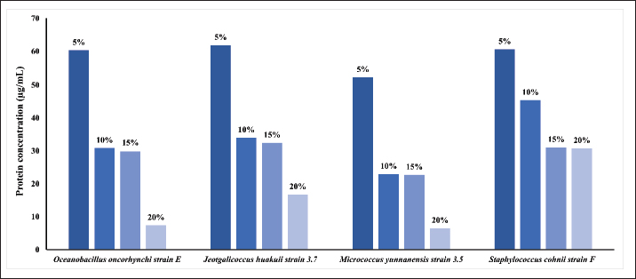 Fig. 3. A comparative analysis showcasing a trend of total protein content in ug/ml within the cells at different salt concentration.