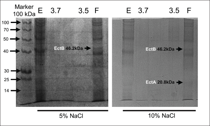 Fig. 4. SDS-PAGE analysis of the total proteins revealed prominent expression of EctB (46.2 kDa) and EctA (20.8 kDa), responsible for ectoine biosynthesis, specifically in S. cohnii strain F only at 10% NaCl and only EctB (46.2 kDa) at 5% NaCl. Antibiotic sensitivity testThe results of antibiotic susceptibility testing using the disk diffusion method for the four bacterial strains was depicted in Figure 5, and data interpretation was provided in Table 1. Each row in the table corresponds to a specific antibiotic, providing details such as the concentration of the antibiotic disc, the antibiotic class, the measured zone diameter in millimeters, and the resulting interpretation of the susceptibility profile. For example, Chloramphenicol, categorized under the Phenicol class, was tested at a concentration of 30 mcg. According to the interpretation criteria, it was classified as resistant (R), suggesting potential ineffectiveness against the tested bacterial strain, sensitive (S) indicates effectiveness of the tested antibiotic. The result suggested that most of the antibiotics including Amoxyclave, Clavulanic, Tetracycline, Ceftazidime, Amikacin, Methicillin were ineffective against all the four strains. In contract, the isolates were sensitive towards Chloramphenicol, Imipenem, Gentamicin, and Ciprofloxacin. The antibiotic resistance profile summarizes the overall susceptibility of the four bacterial strains to each antibiotic, simplifying information for clinical decision-making. The results indicated the importance of antibiotic selection based on the specific characteristics of the bacteria under investigation.
