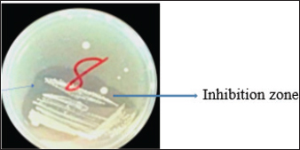 Fig. 1. Inhibition zone produced by Commamonas terrigena against Staphylococcus ATCC25923 by streak method. In-silico analysisIn silico analysis was conducted using the STRING database (Table 4) to examine the protein-protein interactions between the quantified metabolites from wasp-associated bacteria and the test strains. Gallidermin produced by Staphylococcus gallenarium (OR150692) had a positive interaction with S. aureus while Phenazine from P. fragi (OR150689) did not show any interaction with S. aureus and E. coli. Furthermore, bacteriocin from the crude extract of Levilactobaccilus (OR150693) had no positive interaction against S. aureus, E. coli, and L. monocytogenes. In a similar trend, enterocin produced by E. faecalis (OR656467) and E. faecalis (OR656470) did not show matches in the STRING database. The crude extract (Propionicin) obtained from Propionibacterium (OR150691) did not influence the growth of Staphylococcus aureus, E. coli, and L. monocytogenes, respectively. Table 2. Zone of inhibition(mm) of the metabolites against test strains.
