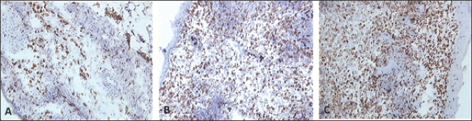 Fig. 4. Skin sections of birds stained with monoclonal antibody KUL01 against macrophages. Two days post inoculation with (A) PBSa, (B) PHA, and (C) FP9. Positive staining for macrophages appeared brown (100x magnification).