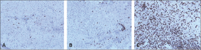 Fig. 6. Skin sections of birds stained with the monoclonal antibody AV296 days post inoculation with (A) PBSa, (B) PHA, and (C) FP9. Positive staining for CD4+ cells appeared brown (100x magnification).