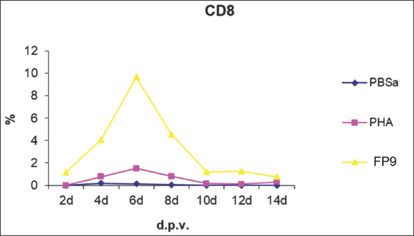 Fig. 7. Kinetics of CD4+ T cell numbers in skin sections of birds vaccinated with FP9. % represents the percentage of the field of view staining positive with an anti-CD4+ T cell monoclonal antibody (AV29), PBSa represented the negative control whereas PHA represented the positive control. CD4+ T cellsSkin sections were stained with the monoclonal antibody AV29, which recognizes CD4+ T cells (Davison, IAH) (Fig. 6). Numbers of CD4+ cells increased slightly from 2 dpv compared to birds inoculated with PBSa and PHA. CD4+ T cells gradually increased to reach a peak at 6 dpv at the site of vaccination in the skin, followed by a gradual decrease from 8 dpv onwards (Fig. 7). CD8+ T cellsSkin sections were stained with the monoclonal antibody AV14, which recognizes CD8+ T cells (Tregaskes et al., 1995) (Fig. 8). CD8+ cells increased rapidly and sharply starting from 4 dpv, and reached a peak at 6 dpv at the site of vaccination in the skin, and then dropped rapidly from 8 dpv onwards (Fig. 9). B cellsSkin sections were stained with the monoclonal antibody AV20 which recognizes Bu-1 on B cells (Rothwell et al., 1996) (Fig. 10). B cells increased in number from 2 dpv to reach a peak at 6–8 dpv at the site of vaccination in the skin, and then dropped in number from 10 dpv onwards (Fig. 11). At 2 and 4 dpv, B cells in skin sections were diffused. The formation of germinal centers (GC)-like structures started appearing at 6 dpv (Fig. 10). At 8 dpv onwards, almost all B cells were aggregated in these GC-like structures. DiscussionPrevious studies indicate that an intradermal inoculation of FPV (both challenge and vaccine strains) into the comb of birds resulted in primary lesions that were restricted to the site of inoculation (Minbay and Kreier, 1973). Local multiplication resulted in the development of lesions at the site of virus entry. Typically, primary lesions appeared by the Fourth day and disappeared by the third week. No secondary lesions developed in any of the birds. No virus was detected in the blood, and the internal organs were free of virus during the infection (Minbay and Kreier, 1973). The challenge FPV was detected on the second day from the lesion samples collected from the comb (site of inoculation). Thereafter, the virus titer increased rapidly to a maximum on the ninth day, and then fell from the 12th day onwards. No virus was detected at 27 dpi. Virus persistence was shorter and virus concentration was lower with the vaccine strain than the challenge strain (Minbay and Kreier, 1973). Another study (Singh et al., 1987) showed that in chickens infected with fowlpox intradermally, the virus was detected in the lungs at 4 dpi which was followed by viremia, at 5 dpi.