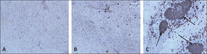 Fig. 8. Skin sections of birds stained with the monoclonal antibody AV14 6 days post inoculation with (A) PBSa, (B) PHA, and (C) FP9. Positive staining for CD8+ cells appeared brown (100x magnification).