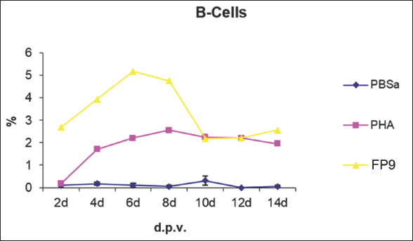 Fig. 11. Kinetics of B cell numbers in skin sections of birds vaccinated FP9. % represents the percentage of the field of view staining positive with an anti-B cell monoclonal antibody (AV20). PBSa represented the negative control whereas PHA represented the positive control. FPV strain FP9 was used in the present study. Its genome has been completely sequenced (Laidlaw and Skinner, 2004), allowing identification of all of the differences (including deletions totaling 22 kb) between it and the USDA standard challenge virus, which was described in the original sequence publication as “pathogenic” (Afonso et al., 2000). FP9 (FPV plaque 9) was derived by plaque purification of a virus that had been passaged some 438 times in CEF culture, the source isolates being HP-1 Munich (Mayr, 1960). Any residual virulence (even for day-old chicks) had been lost by passage 350 (Mayr and Malicki, 1966). FP9 is highly attenuated and possibly introduces genetic deletions/modifications that enhance the immune response elicited by this vector. A comparison of the FP9 genome sequence with the published sequence of a pathogenic FPV reference strain (Afonso et al., 2000) revealed several inserted as well as deleted sequences (Laidlaw and Skinner, 2004). Such deletions/insertions may account for the enhanced capacity of FP9 to elicit T cell responses. This may explain the short persistence of FP9 used in the present study compared to the long persistence for the challenge FPV used by Minbay and Kreier (Minbay and Kreier, 1973). In terms of histopathology, hyperplasia of the epithelium, enlargement of cells and the presence of eosinophilic cytoplasmic inclusion bodies (Bollinger bodies) are common for FPV infection (Giotis and Skinner, 2019). It was interesting to determine which cell types were involved at the site of FP9 inoculation. By virtue of their location at various sites in the body, macrophages are one of the first cells to encounter viruses (Lazarov et al., 2023). The immunological function of the epidermis is principally linked to the presence in this tissue of a distinct subpopulation of Langerhans cells (LC) or macrophages (Neagu et al., 2022). In man, LC constitute 2%–4% of the epidermal cell population, and within the epidermis, they are the only cells that express MHC class II antigens constitutively (Hasegawa et al., 2004). LC plays a key role in the initiation of T cell responses to cutaneous antigens by picking up antigens and migrating to the draining lymph node (in mammals), where they trigger specific T cell activation (Neagu et al., 2022). In our experiment, the skin was inoculated with PBSa as a negative control and PHA as a positive control. In vitro, PHA stimulates T cell proliferation and differentiation, while in vivo the PHA-skin response is an inflammatory reaction, concerning complex interactions of cells—not only lymphocytes but also macrophages and basophils (Hasegawa et al., 2004). In mammals, when an antigen has passed the epithelial barrier of the skin or mucosal surfaces it has to be processed and presented by accessory cells to lymphocytes. These reactions take place in lymphoid organs, such as the regional lymph nodes, Peyer’s patches, and tonsils, but also in the spleen if the antigen enters the blood directly. The respective lymphocyte clone expands by proliferating, and primed lymphocytes of the B and T cell series emigrate from the lymphoid organs (Chambers and Vukmanovic-Stejic, 2020). As there are no lymph nodes in chickens, antigen presentation to lymphocytes may occur within the skin tissue (Lu et al., 2023). From Figures 2 and 3 of the present study, the virus was detected in skin tissue after vaccination at a very high concentration at 2 dpv, to a lower degree at 4 dpv and was almost cleared from 6 dpv. The pattern of macrophage infiltration at the site of inoculation in the skin tissue was similar to that of the virus, in that high numbers were observed at 2 dpv and 4 dpv, and these dropped from 6 dpv onwards (Figs. 4 and 5). The concentration of macrophages in the skin at the site of inoculation was higher than that for the birds which were inoculated with PBSa (negative control) and PHA (inflammatory agent), suggesting that the virus might have been taken up by macrophages. In vitro, PHA stimulates T cell proliferation and differentiation while in vivo, the PHA-skin response is an inflammatory reaction, concerning complex interactions of cells—not only lymphocytes but also macrophages and basophils (Restifo et al., 1994). The use of specific monoclonal antibodies coupled with image analysis (Image pro-plus software), made it easy to assess changes in the quantity of target cells at the site of vaccination. Results of the experiments in the present study suggest that both CD4+ and CD8+ T cells participated in the response. Intracellular organisms (usually viruses) synthesize proteins inside the infected cells, and these antigens therefore gain ready access to the MHC class I pathway; as a result, they often induce strong MHC class I restricted CD8+ T cell responses (these cells are usually cytotoxic, although secrete a variety of cytokines in response to antigen) (Reina-Campos et al., 2021). From Figure 9 of the present study, a rapid increase of CD8+ T cells in skin sections from 4 dpv was observed, which peaked at 6 dpv, at which the virus was almost cleared. Furthermore, antigens synthesized during intracellular infections are usually released from the infected cells into the extracellular matrix, and these soluble materials are taken up by specialized antigen-presenting cells (APCs). Inside these APCs, antigens enter the MHC class II pathway, permitting them to induce MHC class II-restricted CD4+ T cells, which usually provide “help” to B cells. The soluble antigens also encounter B lymphocytes and induce antibody responses (in concert with CD4+ T cell “help”). Therefore, most intracellular organisms are expected to induce strong CD4+, C