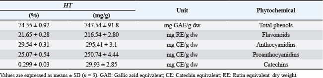 Antioxidant activityRadical scavenging capacity Radical scavenging capacity was measured using 2,2-diphenyl-1-picrylhydrazyl (DPPH) and 2,2′-azinobis (Arreola et al., 2015)-ethylbenzothiazoline-6-sulfonic acid (ABTS) assays and expressed as the percent inhibition of radical activity (Fig. 1). The ability of the HT extract to scavenge ABTS and DPPH radicals was compared with that of the standards BHA and AA.