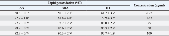 Figure 1. Scavenging activity of the aqueous leaf extract of HT and positive controls against: (A) ABTS- radicals, (B) DPPH, and (C) hydroxyl radicals. Data are presented as mean ± SD (n=3). Bars labeled with different lowercase letters are significantly different (p < 0.05). AA: ascorbic acid; BHA: butylated hydroxyanisole. At low concentrations, the ABTS scavenging activity of the extract was significantly higher than that of the standards (p < 0.05). However, no noticeable differences were observed at high concentrations (Fig. 1A and B) shows the DPPH radical scavenging activity of the standards and aqueous HT extract at different concentrations. At a low concentration (6.25 µg/ml), the aqueous HT extract displayed higher radical scavenging activity than the standards (p < 0.05). At this concentration, the scavenging effects were 93.3%, 84.1%, and 67.1% for the HT extract, BHA, and ascorbic acid, respectively. The scavenging activity of all compounds was concentration-dependent, reaching a maximum at 100 µg/ml. No statistically significant differences were observed at this concentration. Hydroxyl radical scavenging activityThe effect of the HT extract on the formation of the hydroxyl radical (•OH) was evaluated. The HT extract exhibited a potent concentration-dependent hydrogen peroxide scavenging capacity (Fig. 1C). From 6.25 to 100 µg/ml, the H2O2 scavenging capacity ranged from 38.5% to 80.6%. At 100 µg/l, the HT extract inhibited 80.6% of the hydroxyl radical formation, which was significantly higher than that of BHA (74.0%, p < 0.05) but markedly lower than that of ascorbic acid (88.8%) at the same concentration. Lipid peroxidation inhibitionTable 2 shows the inhibitory action of the HT extract on hemoglobin-induced lipid peroxidation in the linoleic acid system. All the tested compounds reduced lipid peroxidation in a dose-dependent manner. At 6.25 µg/ml, the HT extract inhibited lipid peroxidation significantly more than both ascorbic acid and BHA (p < 0.05). However, no significant differences were observed between the compounds at 50 µg/ml and 100 mg/ml (p > 0.05). Table 2. Lipid peroxidation oxidation by the aqueous extract of the Hypericum triquetraifolium (HT) leaf, ascorbic acid (AA), and butylated hydroxyanisole (BHA).
