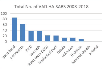 Methods: From January 1, 2008 to December 31, 2018, all ages of inpatients with a VAD HA-SAB in one District Health Board (DHB) were retrospectively studied. All data was obtained from the Infection Prevention and Control (IPC) SAB records and analyzed.