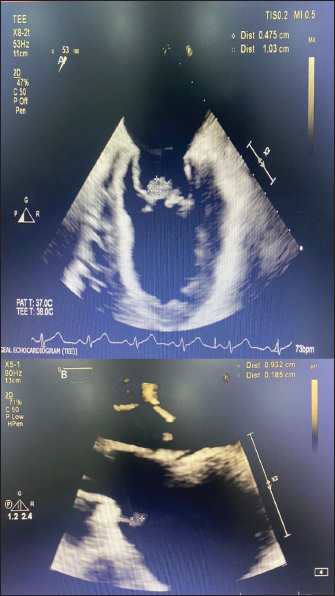 Fig. 1. (A): Transesophageal echocardiography showing vegetation on anterior and posterior mitral leaflets prior to starting combination therapy. (B): Trans-thoracic echocardiography done after a week of combination antibiotic therapy showing decrease in size of vegetation on AML.