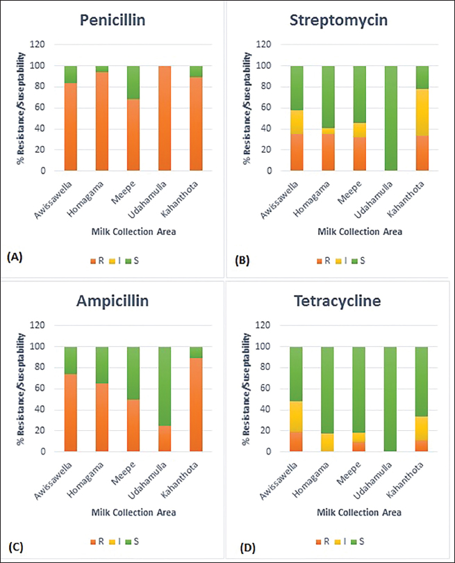 Fig. 3. The percentage of antibacterial susceptibility of positive isolates from different areas to four different antibiotics; (A) Penicillin—G, (B) Streptomycin, (C) Ampicillin, (D) Tetracycline. Our study revealed diverse and notable patterns of antibiotic susceptibility profiles of L. monocytogenes isolates in raw milk of Colombo District. High resistance rates were observed against penicillin (83.13%) followed by ampicillin (65.06%), streptomycin (32.53%), and tetracycline (10.84%). These results resonate with previous studies, underlining the challenge posed by elevated resistance to specific antibiotics. The identification of intermediate resistance for streptomycin (18.07%) and tetracycline (19.28%) suggests a potential towards the gradual development of resistance against these antibiotics in L. monocytogenes. Previous studies have shown that L. monocytogenes derived from both food and animals can be resistant to a variety of medicines including, streptomycin, chloramphenicol, gentamicin, erythromycin, rifampin, and kanamycin (Charpentier et al., 1995; Walsh et al., 2001). Research conducted in the Pollonaruwa District revealed higher resistance levels for ampicillin (60%) with lower resistance for tetracycline (8%), with 40% of isolates exhibiting phenotypic multiple antibiotic resistance (Harshani et al., 2022). Based on the disk diffusion assay, our own research findings revealed higher resistance to penicillin and the lowest resistance to tetracycline. Table 3. Summary of factors leading to milk contamination in cattle farms.
