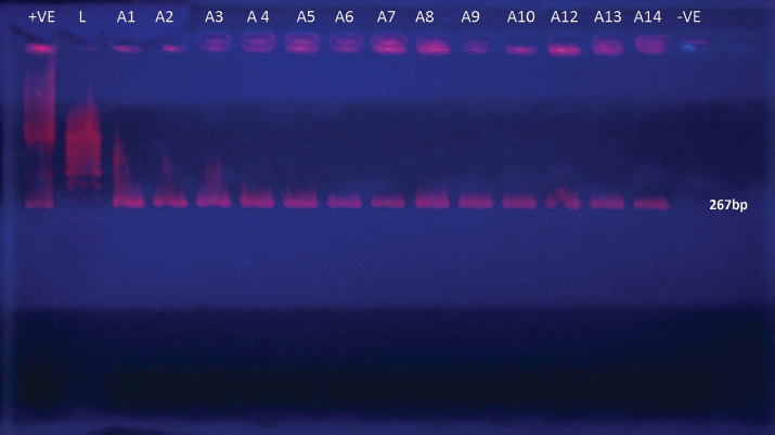 Supplementary Fig. 1. Gel Image for detection of L. monocytogenes by nested PCR. Lane +ve represents L. monocytogenes ATCC 51776 (the positive control for the target gene), Lane L- Ladder, Lanes A1 to A14 correspond to samples from Awissawella 1 to Awissawella 14 respectively and the lane PCR −ve represents the negative control for PCR with Milli-Q water.