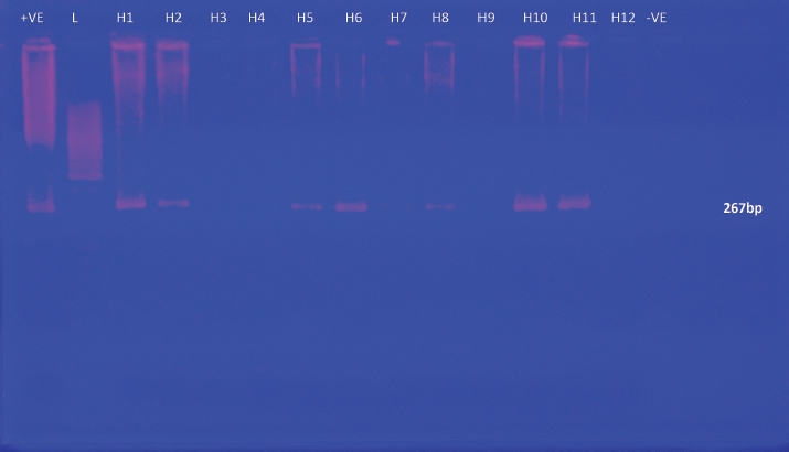Supplementary Fig. 3. Gel Image for detection of L. monocytogenes by nested PCR. Lane +ve represents L. monocytogenes ATCC 51776 (the positive control for the target gene), Lane L- Ladder, Lanes H1 to H12 correspond to samples from Homagama 1 to Homagama 12 respectively and the lane PCR −ve represents the negative.