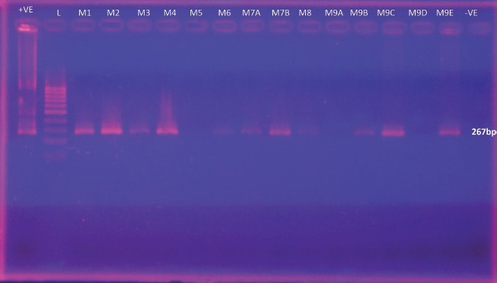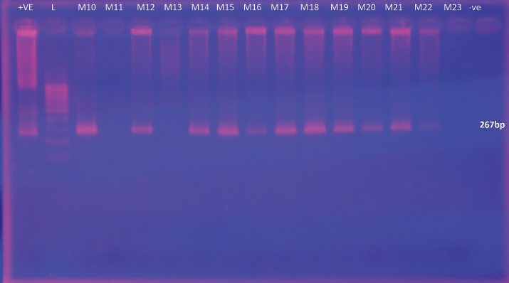 Supplementary Fig. 5. Gel Image for detection of L. monocytogenes by nested PCR. Lane +ve represents L. monocytogenes ATCC 51776 (the positive control for the target gene), Lane L- Ladder, Lanes M10 to M23 correspond to samples from Meepe 10 to Meepe 23 respectively and the lane PCR −ve represents the negative | ||