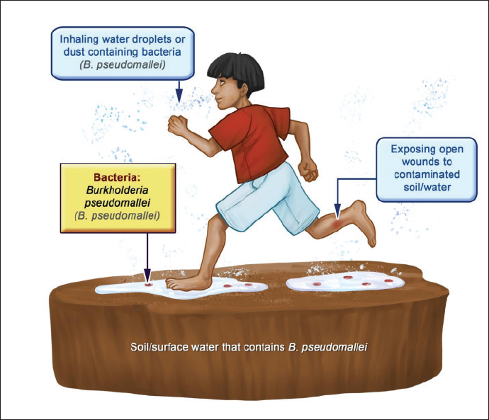 Fig. 5. Route of entry of Burkholderia pseudomallei from environment. DiscussionMelioidosis is endemic in Southeast Asia and northern Australia, with the highest incidence reported in Northeast Thailand and northern Australia (Currie et al., 2011). Risk factors for acquiring melioidosis include diabetes mellitus, excessive alcohol consumption, chronic lung disease, chronic renal disease, and immunosuppression (Currie et al., 2005). In our case series, two patients had diabetes mellitus, which is a well-established risk factor for melioidosis and its complications, including osteomyelitis (Cheah et al., 2022). The clinical manifestations of melioidosis can range from asymptomatic infection to acute fulminant sepsis, depending on the host’s immune status and the inoculum size (Kurniawan, et al., 2011). The route of entry of B. pseudomallei can be from direct percutaneous inoculation during exposure to wet season soils or contaminated water through injuries in skin or to Lungs through inhalation(Fig. 5). Osteomyelitis is a rare complication, occurring in approximately 3.8% of melioidosis cases (Currie et al., 2010). The calcaneus is an uncommon site for osteomyelitis, with only a few reported cases in the literature (Jane et al., 2012; Raja and Scarsbrook, 2016 et al). Table 1. Duration of antibiotics according to site of infection (Darwin Melioidosis Guideline).