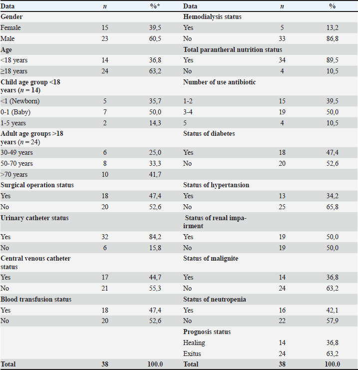 ABSTRACTBackground: Candida-related infections are the leading cause of healthcare-associated infections in intensive care units and are increasing day by day. Aim: This study was started in a university hospital in May 2018 and analyzed to determine candidemia, candiduria, and related factors seen in intensive care units between 2010 and 2015 years. Methods: A retrospective study included 38 patients who developed candidemia and were treated in intensive care for at least 72 hours. The data were presented as numbers and percentages and evaluated by the Chi-square test. Age, gender, history of surgical operation, presence of urinary catheter, presence of central venous catheter, history of blood transfusion, presence of hemodialysis, total parenteral nutritional status, diabetes, hypertension, renal failure, malig nancy, and neutropenia were compared according to candida type and candiduria. Results: The incidence of candida was 3.03% among the patients followed in the intensive care unit during the years included in the study, and the most common candida type was Candida albicans. Non-albicans Candida strains were more common in patients with renal insufficiency. It was determined that candiduria developed more in adult patients than in newborns. Patients with diabetes and malignancies were also found to develop more candiduria. Conclusion: Considering that candidemia causes high morbidity, prolongs hospital stay, and increases hospital costs, it can be seen that the importance of studies to determine the risk factors of candidemia has increased. Keywords: Intensive care, Candida, Candiduria, Associated factors. INTRODUCTIONHealthcare-associated infections, which are known as the most negative consequences of health care, are common all over the world and in Turkey. It has been reported that Healthcare Associated İnfection (HIA) affects 5%–20% of hospitalized patients in general, and in Europe, at least 7.5 million patients are exposed each year, and more than 147,000 people die directly or indirectly from this cause each year (Anderson 2019). Intensive care units are the most common hospital settings where infections are most common due to reasons such as immunosuppression of patients, prolonged hospitalization, long-term disability, antimicrobial resistance, and disease associated with socioeconomic conditions (Miyake et al. 2022; Jalaliet al. 2022). The European Center for Disease Prevention and Control (ECDC) reported in 2019 that 4% of all patients staying in intensive care units for more than 2 days developed pneumonia, 3% had bloodstream infections, and 2% developed urinary tract infections. The vast majority of these infections can be prevented by applying infection control methods. (ECDC 2016). Candida-related infections are the leading healthcare-associated infections in intensive care units. In studies on this, it has been reported that the average incidence of candidemia per 1000 patients in Europe, including 23 intensive care units, is 5.52. In another study, the prevalence of candidemia attacks per 1000 intensive care patients was reported as 6.87 (Basetii et al. 2019; Kett et al. 2011). Although Candida albicans is the cause of the majority of candidemia in intensive care units, it is observed that there is an increase in infections of non-albicans Candida. The increase in the frequency of use of antifungal drugs has increased the incidence of non-albicans Candida species. The most common species are Candida glabrata (C. glabrata), Candida guilliermondii (C. guilliermondii), Candida parapsilosis (C.parapsilosis), Candida krusei (C. krusei), Candida tropicalis (C.tropicalis), Candida lusitaniae (C.lusitaniae), and Candida zeylanoides (C. zeylanoides) (Altun et al. 2023). In some countries, C. glabrata is the most common, while in others, C. parapsilosis is seen. Although C. parapsilosis is a commensal microorganism of human skin, it can be transmitted from person to person through contaminated sources. In intensive care units, parenteral nutrition is becoming a worrisome species due to their location on inert substrates such as intravascular catheters (Töth et al. 2019; Martini et al. 2020; de Pauala et al. 2020). In a study involving 6 different centers in Turkey, 2,547 yeast isolates were obtained in a 6-year period. In intensive care units, C. albicans ranked first with 476 (45.2%) isolates, followed by C. parapsilosis complex (28.7%), C. glabrata (10.7%), and C .tropicalis (7.3%) (Ergon 2020). The most effective protection in Candidiasis is the maintenance of normal flora balance and an intact immune system. Although the main risk factors for the development of infection of candida species are factors that depress the immune system such as total parenteral nutrition status, presence of a central venous catheter, and use of broad-spectrum antibiotics, some researchers have expanded them to obtain different risk patient groups. In this study, it was conducted to determine the factors associated with candidemia of nosocomial infection. MATERIALS AND METHODSThis study is cross-sectional analytical. The data were collected retrospectively by examining the files of patients hospitalized in the intensive care unit of a university hospital between January 1, 2010 and December 31, 2015. A total of 1253 patients treated in intensive care units over a 5-year period were included in the study. Research inclusion criteria: “Candida spp. growth in blood culture” and “having been treated in the hospital for at least 72 hours.” While all candidemia patients between the ages of 1 and 92 years were included in the study, no exclusion criteria were determined. The diagnosis of candidemia and candiduria was made on the basis of CDC (Centers for Disease Control and Prevention) diagnostic criteria by creating sufficient colonies in the laboratory environment of the samples taken from the patients. The records of 1253 patients treated in the intensive care unit between January 1,