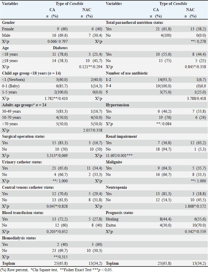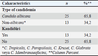 It was determined that 23.7% of the patients were admitted to the hospital due to gastrointestinal problems, 13.2% had cardiovascular, 13.2% had neurological diseases, and 13.2% had a history of infectious diseases. There were no patients with a history of burns or trauma as an indication for hospitalization. All of the patients received antibiotic therapy and antifungal therapy. Half of the patients used 3-4 different antibiotics. The antibiotics they use; it was observed that they used carbapenem the most, cephalosporin in second place, and penicillin in third place. Data on candidemia detected in patients are given in Table 2. When the types of candidemia detected in the patients included in the study were examined, C. albicans in 65.8%; non-albicans strains were found in 34.2% of them. It was determined that the detected non-albicans consisted of species such as C. tropicalis (n=5), C. parapsilosis (n=4), C. krusei (n=2), C. glabrata (n=1), and C. membranifaciens (n=1). In addition, candiduria was detected in 34.2% of the patients.Some data with candida species are compared in Table 3. The relationship between surgery, urinary catheter, central venous catheter, blood transfusion, hemodialysis, TPN, and Candida type was not statistically significant (p > 0.05). It was determined that more than half of the patients with candiduria underwent a urinary catheter and blood transfusion, although it was not statistically significant. The relationship between renal failure and candida type was found to be statistically significant (p < 0.05). Accordingly, it was observed that non-albicans Candida type was more common in patients with renal failure and C. albicans type was more common in patients without renal failure. The relationship between diabetes, hypertension, malignancy, neutropenia, and candida type was not statistically significant (p > 0.05). Some sociodemographic characteristics were compared with candiduria and given in Table 4. The relationship between age group and candiduria was found to be statistically significant (p < 0.05). Accordingly, it was observed that the development of candiduria was higher in adult patients than in newborns. It has also been determined that patients with diabetes and malignancy have more Candidia. DISCUSSIONCandida is one of the most important types of fungal infections that are becoming more common. It causes the rapid colonization of candida species on the human organism. Although invasive interventions such as catheter application to patients cause this colonization, it has been reported in the literature that the use of broad-spectrum antibiotics and abdominal surgery in patients hospitalized in intensive care units, those receiving immunosuppressive therapy, and abdominal surgery are factors that increase the risk of infection (Altun et al. 2023). In this study, 3. It was determined that there were 38 patients diagnosed with candida and candiduria in the intensive care units of a step-training and research hospital within a 5-year period. In a study, it was reported that 30 candidemia infections were produced in the one-year Intensive Care Unit, the majority of which were non-C. albicans species. In the same study, it was reported that the one-year incidence of candidemia was 14.72 per 1000 patients (Kerget et al. 2020). In a study conducted in a tertiary care hospital, 150 healthcare-associated (SHI) candidemias were detected in all clinics according to the patient files examined retrospectively between 2014 and 2019 (Çeviker et al. 2020). When the years covered by our study periods are compared with the years covered by other studies, it is seen that there is an increase in candida infections over the years. In this study, C. albicans was seen in 65.8%, while the incidence of other species was 34.2%. In the study conducted in a tertiary care hospital, it was reported that C. albicans was detected more than other species (66.3%), and C. albicans was the highest in all intensive care units where the study was conducted (Eren et al. 2023). Candida albicans has been frequently reported in Serbia, China, Australia, and Turkey. Candida albicans was reported to be most frequently isolated in Serbia (Arsic et al. 2018), China (Guo et al. 2017), Australia (Chapman et al. 2017), the Netherlands (Wouters et al. 2018), and Turkey (Yeşilkaya et al. 2007; Bilgi et al. 2015). It is seen that the majority of patients with candidemia are adults. In our study, it was determined that 63.2% were 18 years of age or older. Candida species were detected in 176 (11.2%) of a total of 1576 clinical urine samples in India, while the incidence rate was high in the 21–30 age group, it was reported that the lowest incidence was in the 71–80 age group (Mishra et al. 2022). In a study conducted in pediatrics clinics, it was reported that candida infection was detected in 37 cases over a period of 4 years (Ertek 2020). In another study, the mortality rate from candidemia was 9.5% in children (Çetin et al. 2024). In a study conducted in a tertiary care hospital, it was reported that the most frequently isolated species from all samples were C. albicans (n=185/279, 66.3%), while it was seen in the pediatric intensive care unit (n=11/17, 64.7%) (Eren et al. 2023) This shows that candida infections are more common in adult patients. Table 3. Comparison of some data with Candida species.
