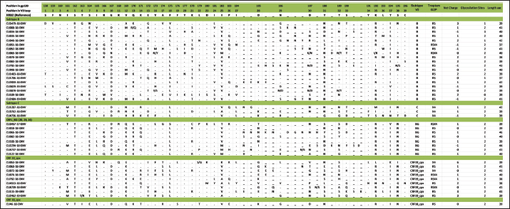 Mutations in the V2 and V3 regions of the envelope protein gp 120, in the Cuban sequence s of HIV-1 mutations in the V2 and V3 loopA comparison of the amino acid sequences of the V3 loop among the 69 samples showed significant differences between the different subtypes. In 40 (57.97%) of the 69 sequences of the env gene, it was possible to analyze the V3 region and V2 variable region. The length of the sequences varied between the samples studied, being CU051-18 the shortest (37 amino acids, subtype B, R5X4 tropism), and CU066-18 the longest (46 amino acids, CRF_BG, R5 tropism). The average length of the sequences was 40.05 amino acids with multiple deletions and insertions, particularly in the hypervariable region. Similar to what was observed for V3, some differences related to the viral subtype were observed in the amino acid sequence (Figs. 5 and 6). Mutations in V2 and V3 are associated with a change in tropism and resistance to MVCWhen analyzing the V3 loop sequences of the 69 samples studied, we were able to observe that, in general, 54 (78.26%) presented at least one mutation associated with resistance to MVC. In the present investigation, the X13H mutation, also called P/T308H, (depending on whether only the position from the beginning of the V3 loop or gp 120 is taken into account) was frequently detected in almost all the viral variants studied, except in subtype C, where I323V was found, although to a lesser extent. The A316T mutation was also present in the non-B subtype samples (except for CRF19_cpx). The G11R mutation was detected in subtype B and C samples (p=0.012 OR: 10.36 CI: 1.15–92.90), while the X13R mutation was frequently observed in non-B subtype samples (p=0.0004 OR: 32.47 CI: 1.89–556.37). The change from A to K at position 25 (A25K) was only observed in a few samples, all of which were subtype B (Figs. 5 and 6). It was shown that the X13R mutation was more frequent in untreated patients than in treated patients, 17/33 (51.52%) (p=0.044, OR: 2.76, CI: 1.02–7.50), and for the rest of the described mutations no significant differences were found. In the V2 region, an extensive bibliographic search was carried out to investigate the mutations related to resistance to co-receptor inhibitors that have been described in various studies. We identified the V169M mutation, detected in five samples of the present study (CU008-18, CU035-18, CU998-18, CU1403-18, and CU2484-19), all of subtype B and with CCR5 tropism. The N192K mutation was also detected in another five samples (CU052-18, CU065-18, CU083-18, CU1706-18, and CU3029-18), all also of subtype B and with variable tropism: three R5, one R5X4, and one X4. Glycosylation patterns in the V3 and V2 loopsThe average of the glycosylation sites found in the V2 and V3 loops of the sequenced Cuban samples was 1.85 and 0.97, respectively. In 66 of 69 V3 loop sequences (95.65%), a single glycosylation site was identified (positions 6–8 of the V3 loop). Only two subtype C samples (CU043-18, CU3762-18) and one CRF_BG (CU092-18) did not show this pattern. Sample CU018-18 presented an additional glycosylation site at positions 32–34 of the V3 loop. Of the 40 samples that underwent V2 analysis, 82.5% (33/40) had two glycosylation sites, 2.5% (1/40) had none or three sites, and 12.5% (5/40) presented only one. Except for four samples (CU5479-17, CU109-19, CU2484-19, and CU4739-18), the rest had a glycosylation site at positions 3–5, but the majority of the glycosylation sites were found at positions 185–190, being mostly the NNXS(T) type pattern. Additionally, two of the samples had patterns at positions 34–38 of V2. When analyzing the net charge, values lower than those reported for the V3 loop (average 1.22) were observed, probably because there is a greater number of negatively charged amino acids (D and E). In our study, no significant differences were detected in the glycosylation patterns related to tropism, or with the viral subtypes. Table 4. Comparison of prediction of co-receptor use between detected HIV subtypes.