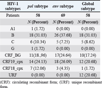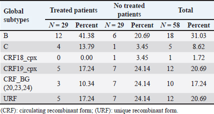 When comparing the viral load values between the different viral subtypes, taking into account the variant detected when sequencing the env gene (Fig. 4A), pol (Fig. 4B) and in the analysis of the global subtype (Fig. 4C), differences were observed in the viral load values between the subtypes, demonstrating significantly higher viral load figures for the CRF19_cpx viruses, compared to the other viruses (p ≤ 0.05). On the other hand, subtype B showed significantly lower values of viral load, in relation to the other subtypes. Table 3. Global HIV-1 subtype in treated and untreated patients by partial sequencing of two regions of the virus.
