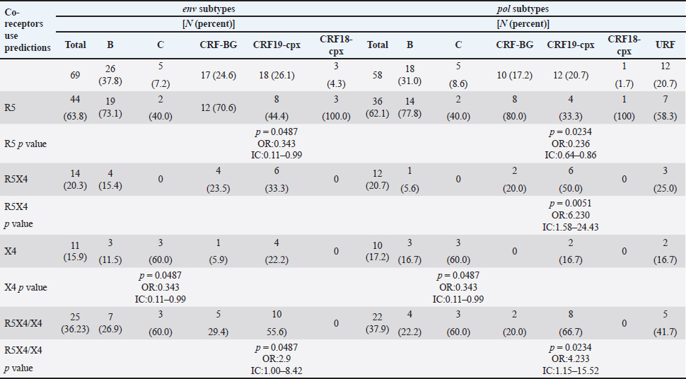 AbstractBackground: Tropism is determined by the ability of HIV-1 to bind to the receptors C-C chemokine receptor type 5 or C-X-C chemokine receptor type 4 (CXCR4) to enter the target cell, which has implications for the pathogenesis of the disease and affects treatment options. This study determined the relationship between the tropism of HIV-1 variants circulating in Cuba, with different variables, and the implications for the use of co-receptor inhibitors. Methods: Plasma samples from 69 of HIV-1 seropositive patients, period 2017–2019, were analyzed. Fragments of the env and pol regions of the virus were sequenced. The subtype and prediction of the viral phenotype, viral mutations, as well as the relationship of the phenotype and subtype with clinical, epidemiological, and virological variables were determined. Results: The recombinant CRF19_cpx (p =0.0234) showed a significant association with viruses that use the X4 and R5X4/X4 Co-receptor, even in untreated patients. Of the viruses studied, 78.26% presented at least one mutation associated with resistance to Maraviroc (MVC), although the patients had not received prior therapy with this drug. Conclusion: The preferential tropism for the CXCR4 co-receptor, detected in the CRF19_cpx variant, accompanied by greater viral replication and unrelated to the time of diagnosis of the patients, reinforces the hypothesis that the viral variant is more pathogenic. The high frequency of polymorphisms and mutations that confer resistance to MVC in the V2 and V3 regions of HIV-1 of the Cuban recombinant forms indicate that there could be a natural resistance to this antiretroviral. Keywords: HIV-1, Maraviroc, Tropism, CXCR4, CRF19_cpx. IntroductionThe variability of the HIV env gene, which plays an important role in infection and antigen recognition, has been the main obstacle to the development of vaccine candidates and new therapeutic strategies. The V3 loop, present in the env gene, is a component of the chemokine receptor-binding region and is the major determinant of Co-receptor usage. The functional importance of V3 lies in the fact that a deletion in it can completely alter the infectivity of the virus. In contrast, V2 is not essential for infectivity; however, it participates in various functions of the env gene associated with escape from neutralization mediated by V3-specific antibodies, due to changes in its length and glycosylation patterns (Zolla-Pazner and Cardozo, 2010). Viral variants that use the C-C chemokine receptor type 5 (CCR5) are characterized in cell cultures for being non-inducing syncytia, having a low replication rate, tropism for macrophages, and predominating in the early stages of infection, being classified as viruses with the R5 phenotype. Those viruses that use the C-X-C chemokine receptor type 4 (CXCR4) for cell entry, mainly infect T cells and stand out for their ability to induce syncytia, have a high replication rate, and predominate in the late stage of the disease, classifying as virus with phenotype X4. At the same time, there is a group of viruses that are classified as having a dual phenotype (R5X4) due to their ability to bind to both the CCR5 and CXCR4 co-receptors. This is considered to be a transitory phase in the evolution of the R5 virus to X4, although phenotypically they behave like X4 viruses (Sede et al., 2014). HIV-1 has demonstrated its ability to change tropism during the course of the disease, a process that the virus adaptively uses to spread in the presence of antivirals (Smyth et al., 2012). Limited access to antiretrovirals (ARVs) in some parts of the world, suboptimal levels of adherence, resistance, and failure of therapy are some of the existing problems that need to be addressed in the management of HIV infection (Aves et al., 2018). Maraviroc (MVC) is the only drug from the group of co-receptor antagonists approved by the Food and Drug Administration of the United States for the treatment of infection with R5 variants of HIV-1. It is the first ARV to target a host protein rather than a viral protein. Its mechanism of action consists of allosteric inhibition of the union of the glycoprotein gp 120 to the co-receptor CCR5, which prevents the virus from entering the cell (Gulick et al., 2008). Although this drug began to be used in 2007, the existence of genetic variants of HIV-1 resistant to MVC has already been reported. Although the mechanisms by which this occurs are not yet clear, it is known that a group of mutations in the V3 loop of the glycoprotein gp 120 are associated with resistance (Westby, 2007). In Cuba, the first HIV cases were diagnosed in 1986. Data from the National Direction of Epidemiology of the Ministry of Public Health (MINSAP, 2020) show that as of December 2021, 37,028 people were infected with HIV. The male sex is the most affected and accounts for the majority of cases 80.8%. Men who have sex with other men (MSM) represent 88.2% of the male sex, and 92.9% of people living with HIV are under treatment (MINSAP, 2020). It is known that the HIV-1 epidemic in Cuba is atypical compared to the rest of America and the Caribbean, where subtype B predominates. A high diversity of HIV-1 genetic variants, including a high rate of circulating recombinant forms (CRFs) characterizes the epidemic in Cuba. Over the last decade, the detection of the viral variation CRF19 cpx has been associated with rapid progression to AIDS, high viral load values, the X4 viral phenotype, and higher levels of RANTES in patients with less than 3 years since diagnosis (Kouri et al., 2015). The objective of this study was to determine the relationship between the tropism of HIV-1 variants circulating in Cuba, in treated and naive patients, with epidemiological, viral, and clinical variables and the implications for the use of co-receptor inhibitors. Materials and MethodsStudy universeThe universe consisted of 69 plasma samples from HIV-1 seropositive patients, 36 untreated and 33 treated wi