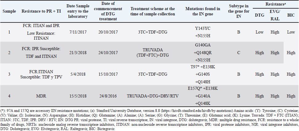 DiscussionReducing the spread of resistance is essential to obtain maximum long-term efficacy from first-line TARVAE regimens. In Kourí et al. (2012) raised the existence in Cuba of high levels of resistance (69.5%, 54.8%, and 44.4% to NRTI, NNRTI, or PI, respectively), due to prolonged exposure to failed therapies (there were limited options for antiviral substitutions), and the use of suboptimal treatment regimens using non-ritonavir-boosted PIs (Kouri et al., 2012). Since 2011, an increase in transmitted resistance has been observed, which in 2019 was manifested in 21.5% of patients, leading to a change in first-line therapies (Machado et al., 2019). Since the beginning of 2018, the new regimens used in Cuba include integrase inhibitors, a new pharmacological group with high efficacy as demonstrated in published clinical trials (Lantero et al., 2019). Table 4. Therapy history of DTG-treated patients with resistance mutations to this drug.