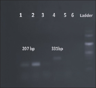 Fig. 3. Amplification of pigP at 207 bp and flhD at 331 bp. Lane 1, 2: PCR product showing amplified pigP gene. Lane 3: negative control. Lane 4: PCR product showing amplified flhD gene. Lane 5: negative control.
