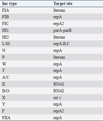 Plasmid incompatibility typingPlasmids were extracted from the transformants using the QIAprep Spin Miniprep Kit (Qiagen, Germany) according to the manufacturer’s protocol. The incompatibility typing of the plasmids was done by PCR-based replicon typing as previously described (Carattoli et al., 2005). The Inc types and their targets are mentioned in Table 2. Typing of virulent S. marcescensThe genetic similarity or heterogeneity of the two S. marcescens isolates was assessed by enterobacterial repetitive intergenic consensus (ERIC)-PCR using primers ERIC F-(ATGTAAGCTCCTGGGGATTCAC) and ERIC R-(AAGTAAGTGACTGGGGTGAGCG). PCR was performed using the following reaction conditions; initial denaturation at 95°C for 3 minutes, 30 cycles of denaturation at 95°C for 20 seconds, annealing at 46°C for 40 seconds and extension at 72°C for 3 minutes; and final extension at 72°C for 10 minutes and the banding patterns were analyzed by agarose gel electrophoresis (Versalovic et al., 1991). Table 2. Inc types and their target sites.