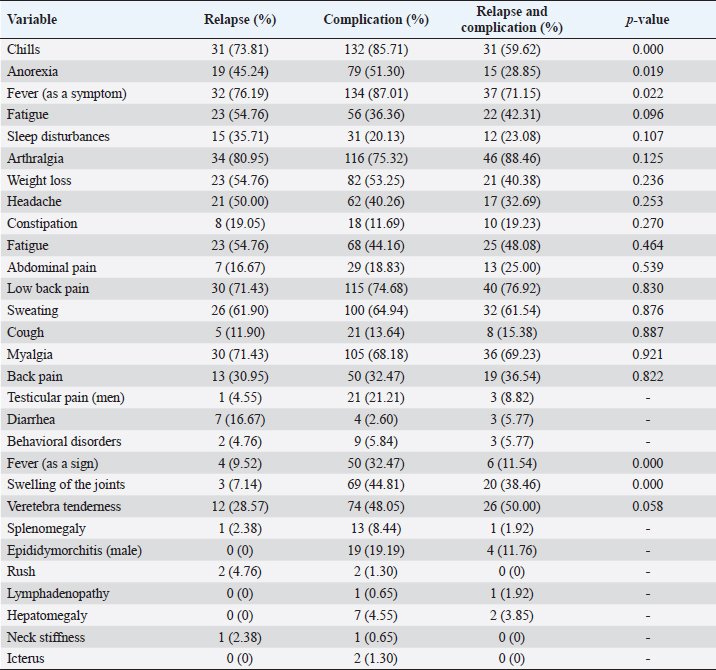 Table 3. Comparison of paraclinical findings in patients with brucellosis in relapse, complication, and relapse-complication groups.