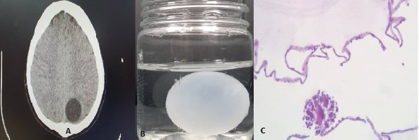 Fig. 1. (A) Brain CT-scan before the operation. (B) Mass that was removed from the frontal lobe of the brain after surgery. (C) Hydatid cyst wall with budding scolex.