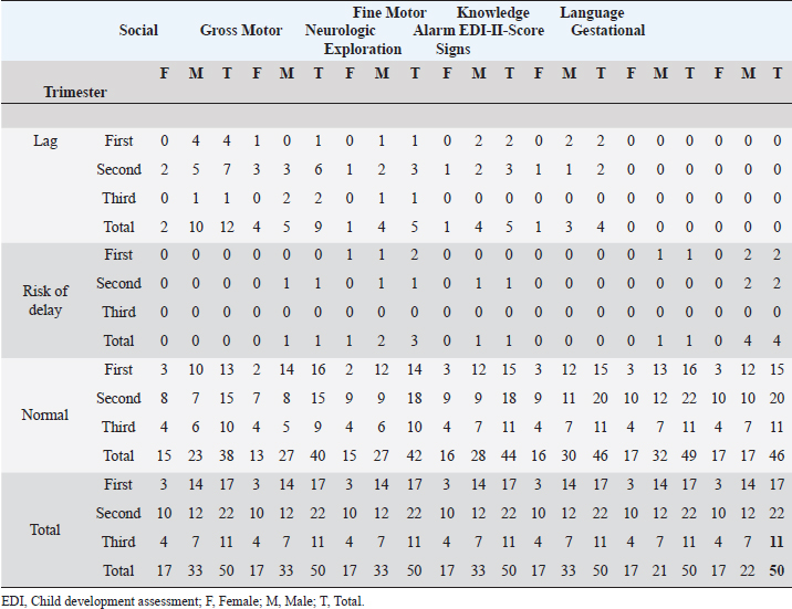 A study of 60 normocephalic and asymptomatic Yucatecan infants about 6 months old, exposed to ZIKV during pregnancy were assessed with the Mullen Scales of Early Learning (MSEL), a test with scales in Motor, Language, and overall Cognitive skills development. All MSEL sub-scale scores except Expressive Language, were significantly lower compared to controls (Familiar et al., 2021). Unfortunately, available medical records for infants did not include information on TORCH, Varicella zoster, or Epstein Barr viruses; thus, it was not discarded as a possible influence of these pathogens. Similarly to our study, the developmental assessment with the EDI-I test of infants 13–24 months after exposition to ZIKV in Oaxaca, México, identified 50% at risk of delay and 33.3% with lag being the Language the main development area affected (Martínez-Pérez et al., 2018). Table 2. Neurodevelopment status by trimester of ZIKV exposition, gender, and area of neurological development.