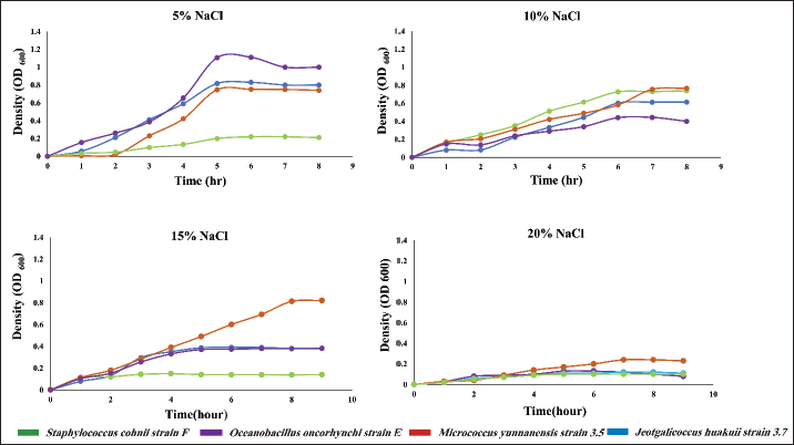 Fig. 1. The growth pattern of all four strains in different time point supplemented with 5%–20 % NaCl.