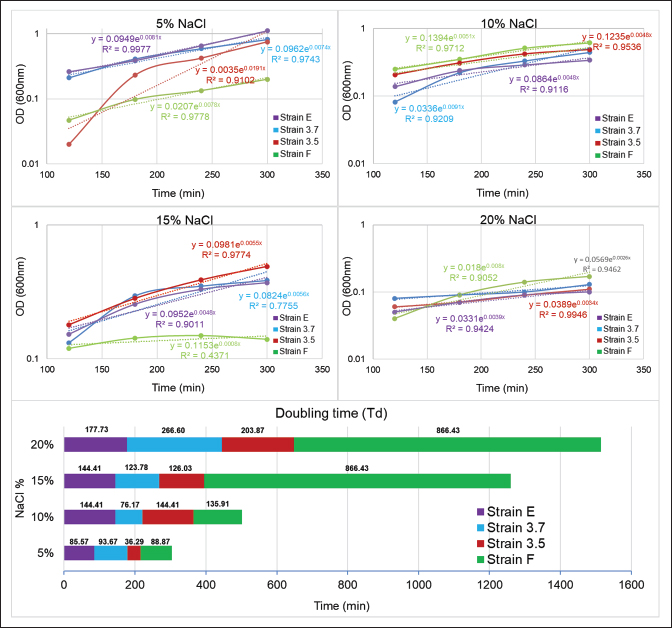 Fig. 2. Comparing doubling time of the 4 isolates in minutes at different salt concentration. Doubling time of the strains at different salt concentrationFor all the isolates the doubling time (Td) increases with increased salt concentration as presented in Figure 2. For instance, Strain E doubled at 85.57 minutes at 5% NaCl, which reached to 177.73 minutes at 20%, indicate the impact of higher salt concentration. Interestingly, strain 3.5, Td decreased at 15% to 126.03 minutes from 144.41 at 10%, indicating its high tolerance and acclimatation to higher salt amount. Protein estimation and expression of ectoine biosynthesis proteinsThe isolation and analysis of total proteins from the four isolates, grown in LB media supplemented with varying NaCl concentrations (5%, 10%, 15%, and 20%), yielded interesting insights. A comparative analysis, illustrated in Figure 3, showcased a trend where total protein content within the cells decreased with an increase in salt concentration. This observation suggests that the expression of only a limited number of proteins possibly necessary for survival in higher salt concentrations. At 5% NaCl, all isolates exhibited a total protein content of approximately 60 µg/ml. However, at 10%–15% NaCl, protein levels were estimated to be in the range of 25–30 µg/ml, with the least observed at 20% NaCl (10 µg/ml). Notably, S. cohnii strain F demonstrated a protein quantity at 20% NaCl similar to that observed at 15% NaCl, i.e., 30 µg/ml. Subsequent SDS-PAGE analysis of the total proteins revealed prominent expression of EctB (46.2 kDa) and EctA (20.8 kDa), responsible for ectoine biosynthesis, specifically in S. cohnii strain F at 10% NaCl and only EctB (46.2 kDa) at 5% NaCl (Fig. 4). Intriguingly, no expression of EctC was detected in either of the strains. Other protein bands with different molecular weights, likely associated with survival or housekeeping functions, were also observed. However, in O. oncorhynchi strain E, J. huakuii strain 3.7, and M. yunnanensis strain 3.5, no expression of ectoine biosynthesis genes was noted. The bands corresponding to other ectoine biosynthesis genes were not identified when these strains were grown in 15%–20% NaCl-supplemented media (data not showed). These findings indicate the strain-specific nature of ectoine biosynthesis under varying saline conditions.