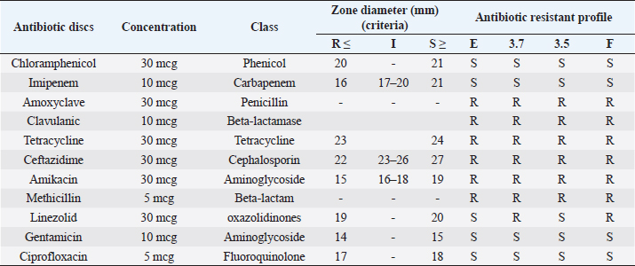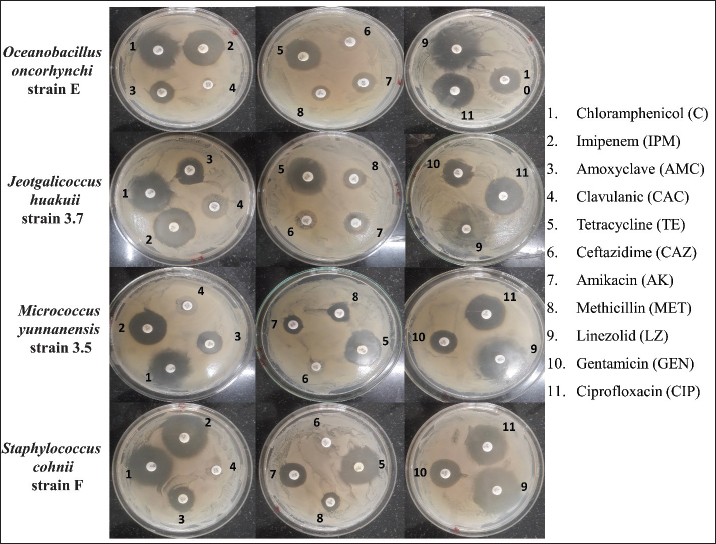 Fig. 5. The illustration of eleven antibiotic resistant profile of the four bacterial strains in LB agar plate carried out through disk diffusion method. Table 1. Antibiotic resistant profile of Oceanobacillus oncorhynchi strain E, J. huakuii strain 3.7, Micrococcus yunnanensis strain 3.5, S. cohnii strain F against 11 antibiotics of different class as per criteria guidelines of CLSI M100-S24 for disk diffusion.