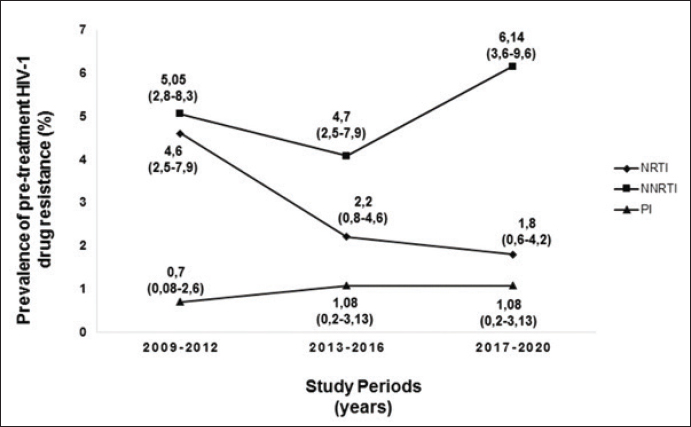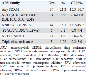 Fig. 1. Behavior over time of pre-treatment HIV-1 drug resistance to different families of antiretrovirals in Cuban LPs studied between 2009 and 2020. NRTI: nuclesoside RT inhibitor; NNRTI: non-nucleoside transcriptase inhibitor; PI: protease inhibitor. Table 3. Characteristics of LPs with mutations associated with pre-treatment HIV-1 drug resistance who died one year after diagnosis of the infection.