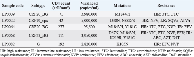 The prevalence of pre-treatment HIV drug resistance is higher than that described by other studies that covered various periods of time (Huaman et al., 2011, Miranda et al., 2022), with a tendency to increase levels of resistance to the NNRTI. Since the introduction of ART in Cuba in 2001, nevirapine (NVP) or efavirenz (EFV) were among the NNRTIs used in the first therapeutic line until their gradual withdrawal based on the results of the national survey pre-treatment HIV-1 drug resistance in 2017 (Machado et al., 2019). These drugs favored the accumulation of mutations associated with resistance to this drug family (K103N, Y181C, and G190A) and the subsequent transmission of the variants with these changes to the population. Several pre-treatment HIV drug resistance studies have described an increase in resistance levels to NNRTIs in low- and middle-income countries (WHO, 2021). The trend of increasing pre-treatment HIV drug resistance to NNRTIs in Cuban LPs contrasts with the values described in a multicenter study carried out in Europe from 1981 to 2019, whose trend is towards a decrease (Miranda et al., 2022). 40% of LPs had CD4+ cell count values below 200 cells/mm3, indicating marked depression of their immune systems. In this group of people, possible reinfection with HIV-1 genetic variants different from the one causing the primary infection and that present mutations in their genome associated with resistance to ARVs, may be one of the causes of detection of pre-treatment HIV drug resistance. Pao et al. demonstrated that resistant variants can persist for up to three years in untreated individuals (Pao et al., 2004) and another research group proposed that they can be detected in patients with chronic infection and with a probable date of infection less than 10 years (Little et al., 2008, Machnowska et al., 2019). The presence of resistant viruses in sanctuary sites and the ability to integrate into the DNA of the host cell favors the persistence over time of HIV-1 variants resistant to ARVs (Chargin et al., 2015; Pasterak and Berkhout, 2023). Several studies have associated a higher prevalence of HIV-1 resistance mutations in subtype B than in non-B subtypes (Vercauteren et al., 2008, Li et al., 2015). In the present study, no association between the described viral variants and the presence of resistance mutations was found. However, a greater presence of mutations was detected in the URFs, which have increased their circulation in the Cuban seropositive population (Machado et al., 2017). The marked immunological deterioration of LPs leads to the appearance of opportunistic infections and diseases associated with AIDS (Antinori et al., 2011), and if we add the presence of mutations associated with the drugs used to control viral replication, the deterioration of health and subsequent death increase. The results described in the study are a clear example of the unfavorable outcome of late diagnosis of HIV infection. The results of pre-treatment HIV drug resistance in Cuban LP agree with the prevalence values detected in several studies carried out in Cuba in the untreated population (Machado et al., 2013, 2019, 2021; Pérez et al., 2013, 2020; Machado Zaldivar et al., 2022). The gradual withdrawal of EFV and NVP from first-line regimens in Cuba and the introduction of dolutegravir will contribute to reducing HIV pre-treatment resistance values in Cuba and reaching viral suppression values above 95%. However, active and timely research, the identification and characterization of social determinants in the epidemiological context of the country, will contribute to the search for new cases and the earlier diagnosis of the infection. ConclusionThe presence of ART-resistant variants in LP evidences the need to perform the HIV genotypic resistance test when diagnosing the infection, in conjunction with the detailed study of various social and epidemiological determinants, constituting an important tool in the management clinical status of these people, will contribute to meeting the goals set by UNAIDS for the year 2030. AcknowledgmentsThe authors would like to thank the doctors responsible for medical care in each of the municipalities selected for the survey, for their assistance in the collection of the samples and the clinical and demographic data of the patients participating in the survey. FundingThe survey was funded by the Global Fund to Fight AIDS, Tuberculosis, and Malaria (www.theglobalfund.org). The opinions referred to in the study are issued by the researchers involved in the study and do not represent the views or opinions of the Global Fund for the fight against AIDS, tuberculosis, and malaria. The Global Fund for the fight against AIDS, tuberculosis, and malaria is not involved in the approval of this manuscript. The funders had no role in study design, data collection, analysis, decision to publish, or preparation of the manuscript. Conflict of interestThe authors do not declare conflicts of interest. Authors contributionsConceptualization: Liuber Y. Machado, Héctor M. Díaz, Liodelvio Martínez; Data curation: Liuber Y. Machado, Héctor M. Díaz, Neisy Valdés, Liodelvio Martínez, Karen Valdés; Formal analysis: Liuber Y. Machado, Madeline Blanco, Marta Dubed, Héctor M. Díaz, Liodelvio Martínez; Research: Liuber Y. Machado, Héctor M. Díaz, Madeline Blanco, Liodelvio Martínez, Enrique Noa, Laura S. López, Karen Valdés, Neisy Valdés; Methodology: Liuber Y. Machado, Héctor M. Díaz, Madeline Blanco, Liodelvio Martínez, María T. Pérez; Administration: Liuber Y. Machado; Supervision: Madeline Blanco, Marta Dubed, Otto Cruz, Mireida Rodríguez; Validation: Liuber Y. Machado, Héctor M. Díaz, María T. Pérez; Visualization: Liuber Y. Machado, Héctor M. Díaz, Liodelvio Martínez, Original draft: Liuber Y. Machado; Writing-review and editing: Liuber Y. Machado, Madeline Blanco, Marta Dubed, Héctor M. Díaz, María T. Pérez, Enrique Noa, Otto Cruz, Mirei