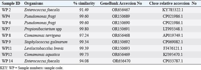 ABSTRACTBackground: Antibiotic resistance is a global problem with high morbidity and mortality in healthcare institutions that requires an antimicrobial alternative and little is known of antibacterial agents derived from insect sources. Aim: The aim of the study was to examine the antibacterial properties of secondary metabolites from insect-associated bacteria. Methods: Thirty-three wasps were obtained from abandoned structures in a local Community. Bacteria were isolated and identified by the Sanger sequencing method. The metabolites were extracted and antibacterial potential was tested against different pathogens. The metabolite concentration was analyzed via high-performance liquid chromatography (HPLC). The metabolites and their clinical potential were explored through STRING analysis. Results: Fifteen bacteria were isolated and 9 exhibited antibacterial properties consisting of Enterococcus faecalis (2). Pseudomonas fragi (2), Propionibacterium spp (1), Comamonas terrigena (2), Staphylococcus galinarum (1), Levi lactobacillus brevis (1). Antibiogram revealed that the secondary metabolite had inhibitory effects against all pathogens. The HPLC results indicated that the control and metabolites were eluted at 1.288 and 1.259 minutes, respectively, with concentrations ranging from 16.68 to 4761.82 mg/l. STRING analysis showed that the metabolites were gallidermin, enterocin, propionicin, and phenazine. Conclusion: The study concluded that the metabolites show activity against test strains and therefore a source of novel antimicrobials for addressing global drug-resistant pathogens. Keywords: Antibacterial Properties, HPLC, In-silico analysis, Secondary metabolites, Wasp-associated bacteria. IntroductionAntibacterial drug resistance has emerged as a grave global health concern, contributing significantly to morbidity and mortality in healthcare institutions worldwide (Oliver et al., 2011). Each year, antibacterial drug resistance is responsible for around 5 million fatalities, causing extended hospital stays, treatment inefficacies, and an increasing reliance on expensive second and third-line antibacterial drugs, further complicating the treatment landscape (Laxminarayan, 2022). In the United States, alarmingly high drug resistance rates have been observed in bacteria with antibiotics such as methicillin, levofloxacin, ciprofloxacin, and clindamycin (Murray et al., 2022). In Europe, multidrug-resistant bacteria are responsible for over 400,000 infections and 25,000 deaths each year (Nwobodo et al., 2022). Likewise in Sub-Saharan Africa and South Asia, the death rates per 100,000 population directly attributed to antibacterial resistance at 24%–22%, respectively. These regions also have high associated death rates (99 and 77 per 100,000) (Nwobodo et al., 2022). The prevailing antibiotic resistance made pharmaceutical companies across the globe introduce different strategies in drug development to combat the drug resistance menace. However, the antibiotic pipeline continues to dwindle, and resistance emerges to successive generations of antibiotics, including tetracycline, macrolides, aminoglycosides, ampicillin, and chloramphenicol (Imran et al., 2018). Even sulphonamides, introduced after the development of resistance to penicillin, faced resistance issues (Laxminarayan, 2022). The introduction of fluoroquinolones as powerful, broad-spectrum antibiotics was a significant milestone in the fight against resistant strains. Nevertheless, resistance to fluoroquinolones emerged, contributing to over 70% of antibiotic resistance-related deaths across all pathogens. Subsequently, the antibiotic colistin was introduced, but resistance developed rapidly. Other alternatives, including phage therapy, nano-treatment, fungi-based sources, and plant-based therapies, were explored but also faced resistance challenges (Laxminarayan, 2022). Innovative approaches are essential to address this pressing public health issue and develop alternative treatments for bacterial infections. Given the failures of antibiotic generations and alternative therapies, there is a growing need to explore novel methods for treating microbial infections. Antibacterial agents sourced from insects remain limited. Hence, exploring antibiotic properties of secondary metabolites produced from wasp-associated bacteria holds promise. Materials and MethodsResearch designThe research design was experimental involving laboratory testing and analysis. The study was conducted at the Department of Microbiology Postgraduate Laboratory, School of Science and Technology, Babcock University, Ilisan-Remo, Ogun State. Collection of samplesThirty-three matured wasps, specifically Sceliphron caementarium (black and yellow wasp), were collected from abandoned buildings in Ishara, Remo, Ogun State, between March and April 2022. The wasp nests from walls and ceilings were dislodged with a broom, followed by capturing the wasps using an aerial net. With the aid of protective hand gloves, the wasps were gently removed from the net, transferred to a sealed plastic container, and transported to the Microbiology laboratory at Babcock University. Microbial isolationMicrobial isolation was conducted using Streptomyces agar supplemented with nystatin. Collected Wasps were subjected to processing, involving serial dilution at a 1:10 dilution (equivalent to a 10-fold dilution), followed by plating on Streptomyces agar for a 7-day incubation period at 37°C. Pure cultures were successfully acquired, streaked onto fresh plates, and then preserved at a temperature of 4°C. Molecular analysis for bacterial genomic DNADNA extraction from bacterial cultures was conducted using Zymo Research’s Quick-DNA™ Fungal/Bacterial Miniprep Kit, involving Proteinase K treatment, centrifugation, and column-based purification. DNA integrity was verified using agarose gel electrophoresis, and DNA yield was quantified with a Qubit 2.0 fluorometer. Molecular identification
