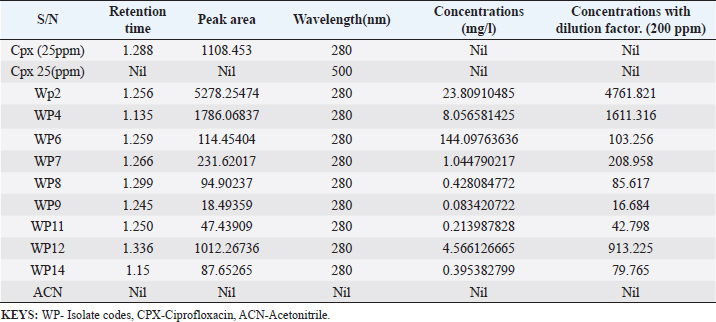 Enterocin produced by E. faecalis (OR656467) exhibited notable inhibition zones, with 9 millimeters against E. coli ATCC25922, L. monocytogenes ATCC19111, and Proteus vulgaris. Similarly, the zone of inhibition ranged from 5 to 7 mm against Staphylococcus aureus obtained from ear, E. coli from stool, and S. aureus ATCC25923. Quinone produced by P. fragi (OR150689) exhibited an inhibition zone of 22 mm against E. coli (from stool) and S. aureus ATCC25923, while a 20 mm zone against Listeria monocytogenes ATCC1911 was measured. Propionicin produced by Propionibacterium (OR150689) exhibited inhibition zones ranging from 25 to 27 mm against four test strains. Metabolites produced by C. terrigena (OR656468) and C. terrigena (OR656469), respectively, demonstrated inhibition zones of 28 mm against S. pyrogen, indicating their consistent antimicrobial activity (Fig. 1). Gallidermin produced by Staphylococcus gallinarum (OR150692) showed inhibition zones of 19 mm against Staphylococcus aureus from obtained from ear and P. vulgaris, as well as 16 mm against S. aureus. Bacteriocins produced by Levi lactobacillus brevis (OR150693) had inhibition zones of 25 mm against E. coli obtained from stool and 22 mm against three test strains, including S. aureus obtained from ear, and L. monocytogenes ATCC19111. A control compound, ciprofloxacin, was also tested, exhibiting varying inhibition zones against the test strains, with the highest being 17 mm against S. aureus obtained from the ear (Table 2). Chromatographic analysisIn this study, the control drug ciprofloxacin (Cpx), analyzed at a wavelength of 280 nm, exhibited a retention time of 1.288 m, a peak area of 1108.453, and unspecified values at 500 nm for retention time, peak area, and concentration. The wasp-associated isolates, specifically WP2, displayed a retention time of 1.256 m, a peak area of 5278.25474, and a concentration of 4761.821 mg/l at 280 nm. WP4 demonstrated a retention time of 1.135 minutes, a peak area of 1786.06837, and a concentration of 1611.316 mg/l at 280 nm. Other isolates, such as WP7, WP8, WP9, WP11, WP12, and WP14, exhibited specific retention times, peak areas, and concentrations at 280 nm (Table 3, Fig. 2). Notably, the retention times of ciprofloxacin (1.288 m) closely aligned with those of the wasp isolates, ranging from 1.135 to 1.336 m. This suggests similarities or close properties between ciprofloxacin and the metabolites produced by the isolates. In contrast, the negative control, acetonitrile, did not show any retention times or peak areas.