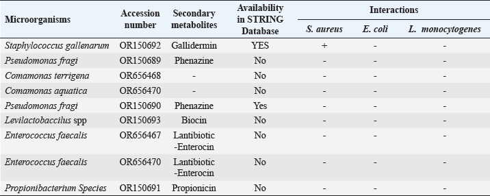 Fig. 3. The network of interactions of Staphylococcus gallenarum (OR150692) bioactive molecules (Gallidermin, ABD31014.1) with Staphylococcus aureus as predicted by STRING. DiscussionNatural products are now the target for alternative sources of antimicrobial agents especially from microorganisms obtained from soil (Newman and Cragg, 2016). Although, reports have revealed that this could also be isolated from insect-based sources (Oh et al., 2011; Poulsen et al., 2011; Chevrette et al., 2019). In our recent study, we examined a diverse range of bacterial strains isolated from insect-based sources capable of producing secondary metabolites with activity against bacterial pathogens. The results revealed that many insect-based bacteria capable of producing small molecules with activity against bacterial pathogens are eminent and therefore, a source of novel antimicrobial agents. A recent report found that insect-based microbes (Streptomyces) exhibit higher inhibitory activity against fungi, Gram-negative bacteria, and Gram-positive bacteria, compared to both soil and plant-associated strains (Chevrette et al., 2019). The implication is that novel antimicrobials with untapped potentials could be sourced from insect microbes. Poulsen et al. (2011) reported 11 distinct and structurally diverse secondary metabolites from insect-associated Streptomyces with activity against bacteria and fungi. This study although, related in design, but differed in the diversity of organisms and the bioactive compound obtained. There are several reasons for this variation; the research interest of the Authors, the isolation protocol adopted, the composition of the isolation media, probably the differences in geographical location, and other unidentified variables. Furthermore, variations in temperature, humidity, soil composition, and vegetation between different locations can lead to distinct microbial populations and subsequently different bioactive compounds. Likewise, host specificity and species variation among the wasps examined in the studies contribute to the differences observed. Each wasp species harbors a unique microbiome influenced by factors such as diet, nesting behavior, and symbiotic relationships (Receveur et al., 2020). Consequently, the diversity of antibiotic-producing bacteria associated with each species varies, resulting in differences in the bioactive compounds they produce. These findings are significant as they unveil the complexity of microbial communities linked with wasps and highlight the antimicrobial potential of the secondary metabolites against diverse pathogens. Elucidating the underlying mechanisms of metabolite production could further enhance their utility and production in the future. In the present study, the analysis of protein-protein interactions via STRING indicated that gallidermin has a strong positive interaction with S. aureus, suggesting its promise as an effective antibacterial agent. This study corroborates the study conducted by Newstead et al. (2020) who emphasized gallidermin’s ability to inhibit both Staphylococcus epidermidis and S. aureus, including the MRSA strain known for its resistance. Similarly, this work affirmed the conclusions drawn by Bengtsson et al. (2018), in the efficacy of the lantibiotic gallidermin in eradicating S. epidermidis and S. aureus while also mitigating the proinflammatory reactions induced by these bacteria in dermal fibroblasts. Gallidermin’s ability to alleviate inflammatory responses triggered by bacteria in dermal fibroblasts has been reported. Overall, these findings suggest that gallidermin could serve as a potent antimicrobial agent, particularly in combating infections caused by S. aureus, S. epidermidis, and other arrays of pathogenic bacteria. The phenazine secreted by P. fragi showed a favorable interaction with Escherichia coli. However, no other bioactive compounds displayed such interactions with the test strains in our study. This could be largely due to limited information within the STRING database with regard to specific interactions with other microorganisms. In this study, the notable inhibitory effect of phenazine, produced by P. fragi, was prominently observed and is consistent with the report of Lim et al. (2017), who emphasized the substantial antimicrobial capabilities of this compound. Apart from the biotechnological perspective, phenazine compounds have the notable potential to inhibit plant-pathogenic fungi and thus are useful in controlling plant diseases (Bilal et al ., 2017; Lauková et al., 2018). Likewise, enterocins are polypeptides with bacteriostatic activity against important foodborne pathogens, such as S. aureus, Listeria monocytogenes, and Salmonella enterica, and purified enterocin E-760 has been proven to inhibit the growth of 24 species of Gram-negative bacteria and 3 species of Gram-positive bacteria. (Wu et al., 2022). A study reported that the administration of Enterocin M led to the reduction of coliforms and Campylobacter and Clostridium spp (Lauková et al., 2018). The clinical applications of biocin and propionicin (bacterocins) have also been reported in the literature with the tract record of antimicrobial properties against pathogens (Grilli et al., 2009; Atassi and Servin, 2010; Carroll et al., 2010; Campion et al., 2013; Lebel et al., 2013). These findings revealed the inherent treasures that could be harnessed from microbes from diverse sources, particularly the untapped insect-associated sources. ConclusionThe study concluded that wasp-associated bacteria have antimicrobial activity against different pathogenic bacteria. This discovery underscores the potential of exploring additional antimicrobial agents from other insect sources to address the global challenge of drug-resistant pathogens. Given the widespread prevalence of antimicrobial drug resistance, there is an urgent need to expand our investigation into unconventional antimicrobial sources, as they may hold th