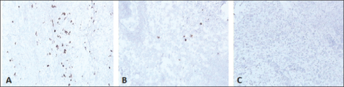 Fig. 6. Skin sections of birds stained with the monoclonal antibody AV296 days post inoculation with (A) PBSa, (B) PHA, and (C) FP9. Positive staining for CD4+ cells appeared brown (100x magnification).