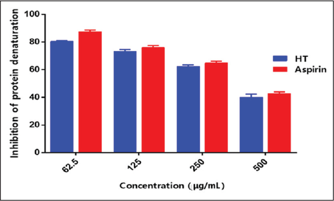 Anti-inflammatory activityBecause inflammation is correlated with protein denaturation, the anti-inflammatory activity of the HT extract was evaluated by quantifying the denaturation of egg albumin. The HT extract inhibited protein/albumin denaturation in a concentration-dependent manner (Fig. 2). The highest inhibition (86%) was observed at 1000 μg/ml. However, the HT extract exhibited lower inhibition rates than the reference drug.