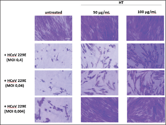 Figure 4. Antiviral activity of HT leaf extract against human coronavirus 229E (HCoV−229E). Viral infectivity, expressed as log TCID50/ml, is shown for cells treated with different concentrations of HT extract (50 µg/ml and 100 µg/ml) compared with the untreated control. Data represent mean ± standard deviation (SD) (n=3).