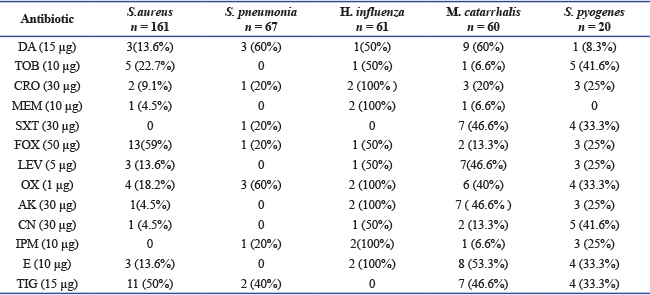 DiscussionAccording to the CDC, asthma is the most prevalent chronic illness in children. People with moderate to severe asthma are at risk for infection, which may trigger asthma attacks, pneumonia, and acute respiratory illnesses (Johnston, 2020). The frequency of childhood asthma varies significantly across countries (Serebrisky and Wiznia, 2019). Like everywhere else in the globe, asthma is a major health issue in Libya has revealed the presence of microorganisms in both the upper and lower respiratory tracts, which are linked to childhood asthma. Early childhood bacterial respiratory infections are strongly associated with the development of asthma. In our study, the frequency distribution of isolated bacteria according to age in Table 2. In healthy hosts, the bacteria often live as commensal organisms in the respiratory tract. However, it can cause illness in children younger than 2 years old, primarily because of the immune system's immaturity (Kumpitsch, et al., 2019). Studies from Turkey show that the frequency of asthma in children is between 8.6% and 12.6% (Jackson et al., 2020; Peters et al., 2020). Our study demonstrated the S. aureus was predominant in age groups. Age appears to have little effect on the association between S. aureus and wheezing diseases. These findings are consistent with investigation that the presence of Staphylococcus bacterium found in nasopharyngeal samples during the first 6 months of life is associated with a higher risk of childhood asthma and recurrent wheezing (Ali et al., 2021). Similary, neonatal colonization with H. influenza, S. pneumonia, and M. catarrhalis has been linked to an increased risk of recurrent wheeze and juvenile asthma (Tang et al., 2021). Collectively, these studies indicate that children's acute asthma episodes are linked to bacterial infections. which supports the findings of our study; however, the population of bacteria and the prevalence of them differs between the studies, this may be due to the environmental variations, study location, and differences in antibiotics resistance patterns. The identification of these bacteria in the airway of asthmatic. Future are warranted to studies clarify the rule of this bacteria and pathways in asthma pathogenesis. Future are warranted to studies clarify the rule of this bacteria and pathways in asthma pathogenesis. ConclusionA number of pathogens, including bacteria, are linked to the onset of asthma, and S. aureus is the primary cause of upper and lower respiratory infections, which are a common cause of acute sickness in children and an exacerbation of asthma. These pathogens are resistant to the most widely used antibiotics. AcknowledgmentI am grateful to the editors and anonymous reviewers for their thoughtful recommendations regarding this research. Conflict of interestThe author declares that there is no conflict of intetest. FundingNo particular grant from governmental or private funding was received for this study. Data availabilityAll data were provided in the manuscript. ReferencesAli, M.T., Abduljawad, N.H. and Al-Zawi, A.S. 2021. The prevalence of asthma AND allergic diseases in school age children in Albayda-Libya. Ejpmr 8(2), 194–196. Asher, I. and Pearce, N. 2014. Global burden of asthma among children. Int. J. Tuberculosis Lung Dis. 18, 1269–1278. Bailey and Scott’s. 2021. Diagnostic microbiology. 15th ed. American Society for Clinical Pathology, Elsevier. Inc. Bokulich, N.A., Chung, J., Battaglia, T., Henderson, N., Jay, M., Li, H., D. Lieber, A., Wu, F., Perez-Perez, G.I., Chen, Y., Schweizer, W., Zheng, X., Contreras, M., Dominguez-Bello, M.G. and Blaser, M.J. 2016. Antibiotics, birth mode, and diet shape microbiome maturation during early life. Sci. Transl. Med. 8, 343–382. Bush, A., Fleming, L. and Saglani, S. 2017. Severe asthma in children. Respirology 22, 886–897. CLSI, 2020. Clinical and Laboratory Standards Institute. Performance Standards for Antimicrobial Susceptibility Testing. 30th ed. Wayne, PA, USA. Earl, C.S., An, S.Q. and Ryan, R.P. 2015. The changing face of asthma and its relation with microbes. Trends Microbiol. 23(7), 408–418. Huang, Y.J. and Boushey, H.A. 2014. The microbiome and asthma. Ann. Am. Thorac. Soc. 1, 48–51. Jackson, D.J., Busse, W.W., Bacharier, L.B., Kattan, M., O’Connor, G.T., Wood, R.A., Visness, C.M., Durham, S.R., Larson, D., Esnault, S., Ober, C., Gergen, P.J., Becker, P., Togias, A., Gern, J.E. and Altman, M.C. 2020. Association of respiratory allergy, asthma, and expression of the SARS-CoV-2 receptor ACE2. J. Allergy Clin. Immunol. 146(1), 203–206. Johnston, S.L. 2020. Asthma and COVID-19: is asthma a risk factor for severe outcomes?. Allergy 75(7), 1543–1545. Jones, H., Lawton, A. and Gupta, A. 2022. Asthma attacks in children challenges and opportunities. Indian J. Pediatrics 89(4), 373–377. Kumpitsch, C., Koskinen, K., Schöpf, V. and Moissl-Eichinger, C. 2019. The microbiome of the upper respiratory tract in health and disease. BMC. Biol. 17(87), 2–20. Langereis, J.D. and De Jonge, M.I. 2015. Invasive disease caused by non-typeable Haemophilus influenzae. Emerg. Infect. Dis. 21, 1711–1718. Loftus, P.A. and Wise, S.K. 2016. Epidemiology of asthma. Curr. Opinion Otolaryngol. & Head Neck Surg. 24(3), 245–249. Marangu, D. and Zar, H.J. 2019. Childhood pneumonia in low-and-middle-income countries: an update. Paediatr. Respir. Rev. 32, 3–9. Peters, M.C., Sajuthi, S., Deford, P., Christenson, S., Rios, C.L. and Montgomery, M.T. 2020. SARSCOV-2 related genes in sputum cells in asthma: relationship to demographic features and corticosteroids. Am. J. Respir. Crit. Care Med. 202(1), 83–90. Redinbo, M.R. 2014. The microbiota chemical symbiosis, and human disease. J. Mol. Biol. 426, 3877–3891. Serebrisky, D. and Wiznia, A. 2019. Pediatric asthma: a global epidemic. Ann. Global. Health. 85(1), 1–6. Simpson, J.L., Daly, J., Baines, K.J., Yang, I.A., Upham, J.W., Reynolds, P.N., Hodge, S., James, A.L