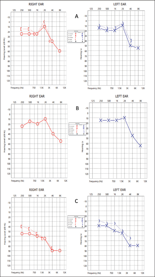 Fig. 2. PTA of both ears at (A): baseline prior to start of amikacin therapy, (B): after a week of starting IV amikacin and (C): 4th week of amikacin. Biofilms are formed on the endocardial surface in infective endocarditis (Elgharably et al., 2016). Pseudomonas aeruginosa is known to produce biofilms that enhance its pathogenicity, and protect it from the immune system. Pseudomonas aeruginosa can adopt either the sessile or the planktonic form during growth. On natural surfaces the planktonic form aggregates and produces an adhesive matrix, forming a biofilm which is an adaptive response to growth in an unsuitable environment. The biofilms are 10–1,000 times more resistant to antibiotics than planktonic cells due to the poor penetration of antibiotics into the matrix as well as altered metabolic activity and protein synthesis of the organisms (Tuon et al., 2022). Thus, traditional beta-lactams may not be sufficient to eradicate P. aeruginosa from biofilms. Historically, adjunctive aminoglycosides which act on the 30S ribosome have been used in the treatment of endocarditis due to Enterococci, Streptococci, and Staphylococci because of their in-vivo synergism with beta-lactams which are cell wall active agents, and their ability to reduce tolerance to penicillin (Jawetz et al., 1950). In the treatment of P. aeruginosa infections also, a combination of an aminoglycoside with a beta-lactam is used owing to the synergistic action when the organism is susceptible to both agents and effective bacterial killing when the beta-lactam agent is resistant (Avent et al., 2022). This is particularly useful in the treatment of infective endocarditis considering the long duration of antibiotic therapy required and the propensity of Pseudomonas to acquire resistance during treatment. Meropenem exposure is associated with the highest risk of resistance development during treatment in P. aeruginosa (Ong et al., 2011). However, the use of aminoglycosides carries a significant risk of nephrotoxicity and ototoxicity. Our patient described above had end-stage renal disease and was receiving hemodialysis thrice a week. The dose of amikacin was timed accordingly to be given after each dialysis session (Heintz et al., 2009). There was no facility available to do therapeutic drug monitoring of amikacin. After explaining the situation to the patient’s relatives regarding the need for aggressive medical management and the possible adverse effects, we continued as per the available recommendations, and serial audiograms were done to monitor hearing. Prolonged courses of amikacin have been used in the treatment of tuberculosis. It is one of the group C agents in the World Health Organization guidelines for the treatment of multi-drug resistant tuberculosis, and it can be given up to 6 months as part of a shortened course of multi-drug therapy. The risk of ototoxicity increases steeply after 6 months of therapy, can progress even after cessation of the drug, and is usually irreversible (Duggal and Sarkar, 2007). Therapeutic drug monitoring should be undertaken during amikacin therapy if such a facility is available. The cumulative amikacin exposure as determined by the cumulative area under the concentration-time curve and duration of therapy, rather than peak and trough plasma levels, are predictors of ototoxicity (Duggal and Sarkar, 2007; Modongo et al., 2015). ConclusionCareful evaluation is required to confirm a diagnosis of infective endocarditis caused by P. aeruginosa, including multiple sets of blood cultures and trans-esophageal echocardiography. A combination regimen with synergistic activity for a duration of 4 weeks can be an effective treatment without surgical intervention. Therapeutic drug monitoring of aminoglycosides should be done where the facility is available. AcknowledgmentsWe thank all the doctors and staff involved in caring for the patient. Conflict of interestThe authors have declared that no competing interests exist. FundingThe authors have no funding to report. ReferencesAvent, M.L., McCarthy, K.L., Sime, F.B., Naicker, S., Heffernan, A.J., Wallis, S.C., Paterson, D.L. and Roberts, J.A. 2022. Evaluating mono- and combination therapy of meropenem and amikacin against Pseudomonas aeruginosa Bacteremia in the Hollow-Fiber infection model. Microbiol. Spectr. 10(3), e0052522; doi: 10.1128/spectrum.00525-22. Duggal, P. and Sarkar, M. 2007. Audiologic monitoring of multi-drug resistant tuberculosis patients on aminoglycoside treatment with long term follow-up. BMC. Ear. Nose. Throat. Disord. 7, 5; doi: 10.1186/1472-6815-7-5. Elgharably, H., Hussain, S.T., Shrestha, N.K., Blackstone, E.H. and Pettersson, G.B. 2016. Current hypotheses in cardiac surgery: biofilm in infective endocarditis. Semin. Thorac. Cardiovasc. Surg. 28(1), 56–59; doi: 10.1053/j.semtcvs.2015.12.005. Falcone, M., Tiseo, G., Durante-Mangoni, E., Ravasio, V., Barbaro, F., Ursi, M.P., Pasticci, M.B., Bassetti, M., Grossi, P., Venditti, M. and Rizzi, M. 2018. Risk factors and outcomes of endocarditis due to non-HACEK Gram-negative Bacilli: data from the prospective multicenter Italian endocarditis study cohort. Antimicrob. Agents. Chemother. 62(4), e02208–e02217; doi: 10.1128/AAC.02208-17. Heintz, B.H., Matzke, G.R. and Dager, W.E. 2009. Antimicrobial dosing concepts and recommendations for critically ill adult patients receiving continuous renal replacement therapy or intermittent hemodialysis. Pharmacotherapy 29(5), 562–577; doi: 10.1592/phco.29.5.562. Jawetz, E., Gunnison, J.B. and Coleman, V.R. 1950. The combined action of penicillin with streptomycin or chloromycetin on Enterococci in vitro. Science 111(2880), 254–256; doi: 10.1126/science.111.2880.254. Lin, T.I., Huang, Y.F., Liu, P.Y., Chou, C.A., Chen, Y.S., Chen, Y.Y., Hsieh, K.S. and Chen, Y.S. 2016. Pseudomonas aeruginosa infective endocarditis in patients who do not use intravenous drugs: analysis of risk factors and treatment outcomes. J. Microbiol. Immunol.