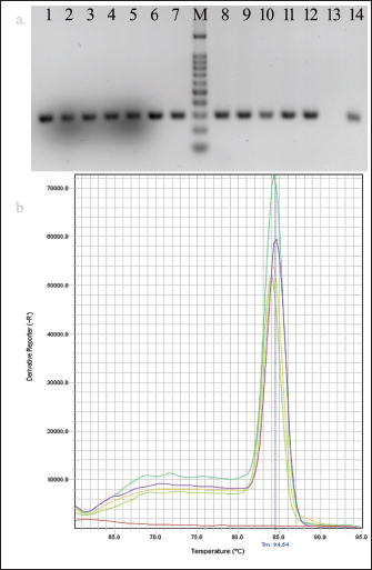 Fig. 1. Data analysis of PCR. (a) Agarose gel electrophoresis showing amplification of mdh gene (304 bp): samples, lanes 1–12; negative control, lane 13; positive control, lane 14 and 100 bp DNA ladder, lane M. (b) Melt curve showing a single peak at Tm of 84.5°C. ConclusionBoth the PCR assay formats targeting the mdh gene may be implemented depending on the infrastructure and equipment facilities of the laboratory to detect E. coli in different samples. Real-time approach needs minimal hands-on time over end-point PCR. AcknowledgmentsWe would like to thank the Mili Barik, project staff of Vidyasagar University for their technical support in the study. We convey thanks to Prof. Ajoy Misra, Director, Instrumental Facility at University Science Instrumentation Centre (USIC), Vidyasagar University for providing the instrumental support. Conflicts of interestAll authors report no conflicts of interest relevant to this article. Financial supportThe financial support for this work came from the University Grant Commission, India (Grant: 30-518/2020). Ethical approvalThe present study was approved by the Ethical committee of Vidyasagar University (VU/IEC-2/7-SD/19). ReferencesAnjum, M.F., Schmitt, H., Börjesson, S., Berendonk, T.U. and WAWES Network. 2021. The potential of using E. coli as an indicator for the surveillance of antimicrobial resistance (AMR) in the environment. Curr. Opin. Microbiol. 62, 152–158; doi:10.1016/j.mib.2021.09.011 Barlaam, A., Parisi, A., Spinelli, E., Caruso, M., Di Taranto, P. and Normanno, G. 2019. Global emergence of colistin-resistant Escherichia coli in food chains and associated food safety implications: a review. J. Food Protect. 82, 1440–1448; doi: 10.4315/0362-028X.JFP-19-116 Das, S. 2023. The crisis of carbapenemase-mediated carbapenem resistance across the human-animal-environmental interface in India. Infect. Dis. Now. 53, 104628; doi:10.1016/j.idnow.2022.09.023 Fuga, B., Sellera, F.P., Cerdeira, L., Esposito, F., Cardoso, B., Fontana, H., Moura, Q., Cardenas-Arias, A., Sano, E., Ribas, R.M. and Carvalho, A.C. 2022. WHO critical priority Escherichia coli as one health challenge for a post-pandemic scenario: genomic surveillance and analysis of current of trends in Brazil. Genomics Proteomics 10, 1256–1277; doi:10.1128/spectrum.01256-21 Ivanetich, K.M., Hsu, P.H., Wunderlich, K.M., Messenger, E., Walkup IV, W.G., Scott, T.M., Lukasik, J. and Davis, J. 2006. Microbial source tracking by DNA sequence analysis of the Escherichia coli malate dehydrogenase gene. J. Microbiol. Methods 67, 507–526; doi: 10.1016/j.mimet.2006.04.026 Liu, Y.X., Qin, Y., Chen, T., Lu, M., Qian, X., Guo, X. and Bai, Y. 2021. Practical guide to amplicon and metagenomic analysis of microbiome data. Protein Cell. 12, 315–330; doi:10.1007/s13238-020-00724-8 Molina, F., López-Acedo, E., Tabla, R., Roa, I., Gómez, A. and Rebollo, J.E. 2015. Improved detection of Escherichia coli and coliform bacteria by multiplex-PCR. BMC Biotechnol. 15, 48; doi:10.1186/s12896-015-0168-2 Omar, K.B. and Barnard, T.G. 2014. Detection of diarrhoeagenic Escherichia coli in clinical and environment water sources in South Africa using single-step 11-gene m-PCR. World J. Microbiol. Biotechnol. 30, 2663–2671; doi:10.1007/s11274-014-1690-4 Poirel, L., Madec, J.Y., Lupo, A., Schink, A.K., Kieffer, N., Nordmann, P. and Schwarz, S. 2018. Antimicrobial resistance in Escherichia coli. Microbiol. Spectr. 6(4), 6–4; doi:10.1128/microbiolspec.arba-0026-2017 Tarr, C.L., Large, T.M., Moeller, C.L., Lacher, D.W., Tarr, P.I., Acheson, D.W. and Whittam, T.S. 2002. Molecular characterization of a serotype O121:H19 clone, a district shiga toxin-producing clone of pathogenic Escherichia coli. Infect. Immun. 70, 6853–6859; doi:10.1128/IAI.70.12.6853-6859.2002 Tran, A., Alby, K., Kerr, A., Jones, M. and Gilligan, P.H. 2015. Cost savings realized by implementation of routine microbiological identification by matrix-assisted laser desorption ionization-time of flight mass spectrometry. J. Clin. Microbiol. 53, 2473–2479; doi:10.1128/JCM.00833-15 | ||