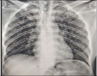 Fig. 2. Chest X-ray revealed multiple bilateral air space nodules. Ethical approvalThe case report meets ethical guidelines and adheres to the local legal requirements. DiscussionDissemination of Mycobacterium TB can happen due to a progressive primary infection or the reactivation of a latent focus followed by lymphohematogenous spread. The exact method by which this happens, meanwhile, is unclear (Krishnan et al., 2010). Inflammatory papules, verrucous plaques, suppurative nodules, chronic ulcers, and other lesions can all be seen in the clinical presentation of cutaneous TB (Lai-Cheong et al., 2007). Metastatic tuberculous abscesses, also known as tuberculous gummas, are rare forms of TB that make up 1%–2% of all cutaneous TB cases (Machan et al., 2018). These are multibacillary forms of cutaneous TB, typically developing when there is a reduction in cell-mediated immunity, which allows the spread of the bacillus hematogenously from the major focus of infection to the subcutaneous tissue (Barbagallo et al., 2002). There is a wide range of clinical presentations of metastatic tuberculous abscesses depending on the organism’s virulence, the route of infection, and the level of immunity of the vulnerable host. The frequent characteristics are defined as single or multiple, painful, cold abscesses with ulceration or fistulae (Almagro et al., 2005) like the present case. Tuberculous gummas most frequently affect the limbs, particularly the thighs and buttocks (Machan et al., 2018) unlike our patient where the axilla and back were mainly involved. Three-fourths of similar cases involve associated sites and the most frequent ones are the lung, lymph nodes, and musculoskeletal system (Machan et al., 2018) unlike our patient, where the lungs and spleen were the associated sites of involvement. One major differential diagnosis of cutaneous TB is scrofuloderma, which has similar clinical and histologic characteristics to metastatic tuberculous abscesses. Scrofuloderma develops as a continuous extension of an infection from an underlying tuberculous focus instead of hematogenous spread (Almagro et al., 2005). The chest X-ray findings suggestive of pulmonary TB and the absence of scrofula, were against scrofuloderma. The cutaneous manifestations in metastatic skin abscesses are most likely due to the result of hematogenous spread of Mycobacterium tuberculous bacteria. Though, there is no chemotherapeutic regimen and duration that is universally recommended for the treatment of metastatic tuberculous abscesses, the typical regimen, 2RHZE/4RH, which is used in the treatment of pulmonary TB, is very effective for the treatment of cutaneous TB (Machan et al., 2018). Similar to a 56-year-old Bangladeshi man who presented with numerous skin abscesses all over his body and responded to anti-TB treatment after a month of starting anti-tubercular therapy, marked improvement was seen in our patient after a month of anti-TB (Alam et al., 2021). Table 1. Summary of laboratory results.