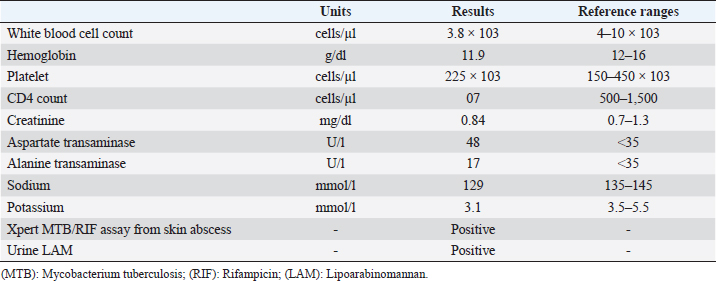 AbstractBackground: Cutaneous tuberculosis (TB) is rare, constituting only 2% of all cases of TB. Metastatic tuberculous abscesses typically result from the Bacillus spreading hematogenously from the main site of infection to the subcutaneous tissue when the body’s cellmediated immunity is compromised and present with one or more non-tender and fluctuant subcutaneous nodules. Case Description: A 51-year-old male presented with a dry cough of 1 month duration associated with vomiting, loss of appetite, and easy fatigability. He had left armpit and lower back skin swellings of similar duration. Findings were whittish coat over the dorsal part of the tongue, crepitation over the lower 2/3rd of the bilateral posterior chest, non-tender fluctuant masses over the left axilla and lower back. Chest X-ray showed multiple bilateral air space nodules and abdominopelvic U/S showed numerous hypoechoic splenic lesions. Urine lipoarabinomannan (LAM) and Xpert MTB/RIF assay from the axillary skin abscess were positive. He was started on antituberculous therapy and showed marked improvement after a month of follow up. Conclusion: It is worth considering the uncommon manifestations of tuberculosis including metastatic skin abscesses in the appropriate clinical context, to avoid misdiagnosis and underreporting in high tuberculosis burden countries. We strongly advise the utilization of Xpert MTB/RIF assay and/or urine lipoarabinomannan for the diagnosis of different forms of tuberculosis including cutaneous TB in HIV positive patients, especially in the absence of sputum for microbiologic tests, like in our patient. Keywords: Disseminated tuberculosis, Cutaneous tuberculosis, Metastatic skin abscesses, Immunocompromised patient. IntroductionDisseminated tuberculosis (TB) is characterized by the presence of two or more noncontiguous sites caused by hematogenous dissemination of Mycobacterium TB, occurring as a result of progressive primary infection or reactivation of a latent focus with subsequent spread (Khan et al., 2016). Even when the typical pathologic or radiologic findings are missing, miliary TB refers to progressive and widely disseminated forms of TB, and it is quite similar to disseminated TB (Salvado et al., 2002). The typical extra-pulmonary TB locations include lymph nodes, pleura, genito-urinary tract, bones, joints, meninges, and peritoneum (Gopal et al., 2000). Cutaneous TB, which is extremely uncommon, constitutes about 2% of all TB cases (Semaan et al., 2008). Patients with metastatic tuberculous abscesses manifest with one or more non-tender, fluctuant, subcutaneous nodules that eventually pierce the skin and give rise to ulcers and draining sinuses (Singal et al., 2022). We have reported the case of a patient diagnosed with disseminated TB with metastatic skin tuberculous abscesses on the background of advanced immunosuppression due to retroviral infection. Case DetailsA 51-year-old male presented with a dry cough of 1 month duration associated with occasional vomiting of ingested matter, loss of appetite, and easy fatigability. He had left armpit and lower back skin swellings of similar duration. He has a history of alcohol consumption of significant amount for 20 years. He tested positive for human immunodeficiency virus (HIV) a week before his current presentation. He has no history of loss of consciousness, abnormal body movement, or neck stiffness. He had no known chronic medical illness. Physical examination revealed blood pressure of 95/60 mmHg, pulse rate of 78 beats per minute, respiratory rate of 20 breaths per minute, temperature of 36°C, oxygen saturation of 95% with room air, whitish coat over the dorsal part of the tongue, crepitation over the lower 2/3rd of bilateral posterior chest, 4 cm by 4 cm non-tender fluctuant mass over the left axilla and 2 cm by 4 cm non-tender, fluctuant mass over the lower back (Fig. 1). Upon investigation, chest X-ray showed multiple bilateral air space nodules (Fig. 2); abdominopelvic U/S showed numerous hypoechoic splenic lesions; complete blood count was non-remarkable; urine lipoarabinomannan (LAM) was positive, and Xpert MTB/RIF assay from the left axillary skin abscess was positive for rifampicin sensitive Mycobacterium tuberculosis (Table 1). Having all those evidences of disseminated TB involving the lung, spleen, and skin, the skin abscesses were drained and the patient was started on anti-tuberculous medications with pyridoxine. He also received fluconazole for oral and esophageal candidiasis. After a week of anti-TB initiation, he was started on highly active antiretroviral therapy. He showed marked improvement after a month of anti-tuberculous therapy.
