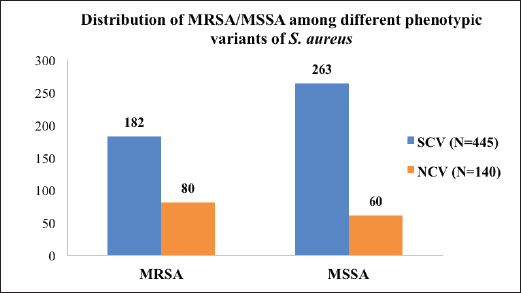 Fig. 1. Distribution of MRSA/MSSA among different phenotypic variants (SCV vs. NCV) of S. aureus (number). Table 3. Showing MRSA/MSSA distribution (%) among the isolates and statistical difference (p value).