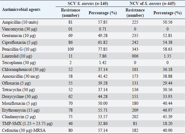 Table 2. Showing association of different risk factors among SCV and NCV isolates of S. aureus (%).