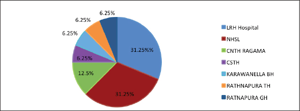 Fig. 2. The distribution of sample receiving centers of herpes virus-positive patients. Fever and headache emerged as the most common symptoms of herpes encephalitis (HE) across all tested herpes viruses. The study provided detailed insights into the clinical characteristics of positive cases, including Ct values, viral load, and specific manifestations in certain patients (Table 2). Among the patients who tested positive for HSV-1, HSV-2, and VZV, gender disparities were noted. HSV-2 positive cases were exclusively male, and HSV-1 positivity was more prevalent in males. The mean Ct values varied for different viruses, indicating potential differences in viral loads. DiscussionHHV infections, caused by HSV-1, HSV-2, and VZV, can lead to various skin and mucous membrane illnesses, including severe complications such as herpetic neuralgia and HE (Schremser et al., 2020). This retrospective study aimed to provide insights into the detection of HSV-1, HSV-2, and VZV in CSF samples from suspected encephalitis patients in Sri Lanka using real-time PCR over a 1-year period. The study also examined the demographic and clinical characteristics of suspected or positive HE patients. Several studies, including Dehghan et al. (2023), Fakhredini et al. (2023), and Ibrahim et al. (2005), have reported the occurrence of HSV and VZV in CSF samples of suspected HE patients. In contrast with Kleines et al. (2014), who found an association between age and positive viral PCR detection, our study, spanning 1,801 patients from 2 days to 88 years, did not detect such an association. Similarly, the prevalence rates of HSV-1 and HSV-2 in our study (9/1,801 and 5/1,801, respectively) were higher than those reported by Koskiniemi et al. (1997), highlighting the variability in herpesvirus prevalence across populations. In a study by Dehghan et al. (2023) involving 149 children, 7.3% showed viral DNA for herpes viruses. In our larger study (1,801 patients), HSV-1 and HSV-2 were detected in 0.65% and 0.16% of 618 children, respectively. This suggests a relatively lower prevalence among children in our population compared to the study done by Dehghan et al. (2023). Table 2. Categorization of clinical and demographic features of herpes virus-positive patients.