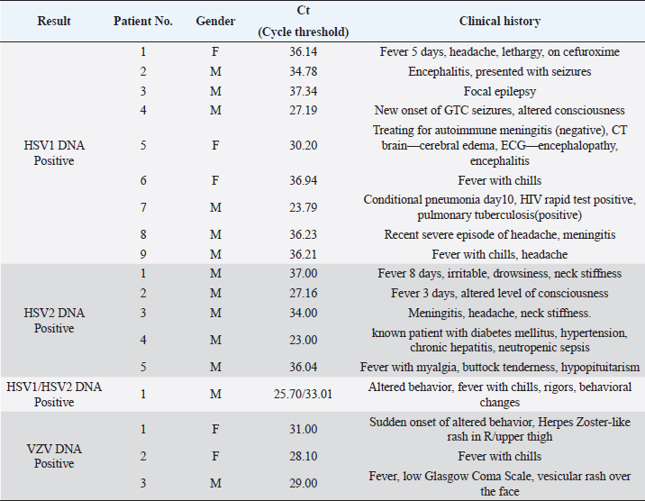 AbstractBackground: Encephalitis is a rare and serious brain infection that can be fatal. Viruses are common infectious agents causing encephalitis. Prompt detection of human herpes viruses in Cerebrospinal fluid (CSF) is crucial for early diagnosis and timely initiation of appropriate treatment, as this can significantly improve patient outcomes. Aim: This study aimed to determine the presence of herpes simplex virus (HSV) type 1, 2 (HSV-1, 2) and varicella–zoster virus (VZV) in CSF samples of suspected herpes encephalitis (HE) patients and to analyze demographic and associated clinical features. Method: All CSF samples from HE-suspected patients from different hospitals and/or facilities received at the Medical Research Institute in Sri Lanka from January 2022 to January 2023 were included in this retrospective study. Real-time polymerase chain reaction was used to detect HSV1, 2, and VZV in the samples. Results: From 1,801 suspected HE cases (mean age 25.67; range 2 days to 88 years; male: female; 1,003: 798), 18 (0.99%; male: female; 13: 5) were positive for herpes viruses; HSV-1(9, 0.50%), HSV-2 (5, 0.28%), HSV1 and 2 (1, 0.06%), and VZV (3, 0.17%). HSV-1 positivity: infants 0.54% (1/184), children 0.65% (4/618), and adults 0.63% (4/627). HSV-2: children 0.16% (1/618), adults 0.48% (3/627), and older adults 0.57% (1/175). VZV: adults 0.31% (2/627) and older adults 0.57% (1/175). Prominent symptoms: fever and headache. Conclusion: HSV-1, HSV-2, and VZV were detected in CSF samples as causative agents of encephalitis-suspected patients, and no significant association was observed with age groups. Further studies are needed for a proper conclusion. Keywords: Cerebrospinal fluid, Encephalitis, Herpes simplex virus, PCR, Varicella–zoster virus. IntroductionEncephalitis, characterized by inflammation of the cerebral parenchyma, manifests with neurological dysfunction and can result from immune system malfunctions or infections. Infectious agents such as viruses, bacteria, and fungi contribute to encephalitis, with human herpesviruses (HHV), particularly herpes simplex viruses (HSVs) and varicella–zoster virus (VZV), recognized as significant causative agents (Glaser et al., 2006). This study delves into the epidemiology of herpesvirus-related encephalitis, focusing on HSV-1, HSV-2, and VZV, with the aim of enhancing our understanding of the prevalence, clinical manifestations, and demographic patterns of these infections in suspected encephalitis patients in Sri Lanka. HSV, particularly HSV-1 and HSV-2, are known to trigger a broad spectrum of neurological manifestations (Bergström et al., 2021; Silva et al., 2022). Herpes simplex encephalitis (HSE) is a rare but severe manifestation of HSV infection, affecting approximately 1 in 250,000–500,000 people annually globally (Babaei et al., 2021). The clinical presentation of HSV encephalitis includes fever, headache, altered consciousness, focal neurological signs, and seizures (Whitley et al., 1986; Babaei et al., 2021). Mortality rates for untreated cases can reach 70%, and even with the administration of necessary therapy, a significant proportion of patients may experience persistent neurological abnormalities (Whitley and Baines, 2018). While HSV-1 is the predominant cause of HSE in adults and children, HSV-2 is associated with HSE in newborns with disseminated infection and immunocompromised individuals (Kennedy and Chaudhuri, 2002). VZV is another member of the herpesvirus family that can cause encephalitis. Particularly, it accounts for a significant portion of pediatric encephalitis cases in developed countries (Lohitharajah et al., 2017; Dheerasekara et al., 2020). The diversity in clinical manifestations and potential complications of herpesvirus infections necessitates thorough diagnostic approaches for timely and effective management. Cerebrospinal fluid (CSF) molecular testing for HSV infection, particularly using real-time polymerase chain reaction (PCR), has proven to be an extremely sensitive and specific approach (Basso et al., 2020). This method has replaced brain biopsy as the gold standard for diagnosing HSE and herpes meningitis (Schremser et al., 2020). Early detection of HSV-1 and HSV-2 in CSF using real-time PCR is critical for timely intervention, especially within the first week after symptom onset (DeBiasi et al., 2002). Delaying treatment or initiating acyclovir therapy after 3–5 days can significantly impact the sensitivity of PCR (DeBiasi et al., 2002). PCR for HSV-DNA and VZV-DNA is included in the first-line virology test panel for clinically suspected acute central nervous system infections in adult patients (Basso et al., 2020). This retrospective study aimed to provide a comprehensive overview of the detection of herpesviruses (HSV-1, HSV-2, and VZV) in CSF samples from encephalitis-suspected patients. The study spanned the period between January 2022 and March 2023, aiming to analyze real-time PCR results in conjunction with demographic and clinical characteristics. Materials and MethodsThis laboratory-based retrospective investigation involved the analysis of CSF samples received at the National Reference Virology Laboratory, Medical Research Institute, Sri Lanka, between January 2022 and March 2023. The age distribution of positive patients was categorized according to the age designations of the American Medical Association (NIH, 2023). DNA extraction from CSF samples utilized BioFlux, following the manufacturer’s recommended methodology. Real-time PCR assays were performed using commercial kits for HSV-1, HSV-2, and VZV (artus® HSV-1/2 RG PCR Kit, artus® VZV RG PCR Kit, QIAGEN GmbH, Germany). Demographic and clinical characteristics were extracted from request forms. In addition, previous records of HSV-positive patients were scrutinized for the presence of other encephalitis-causing agents, including enteroviruses, dengue, japanese encephalitis virus, adenoviruses, cytomegalovirus, infl